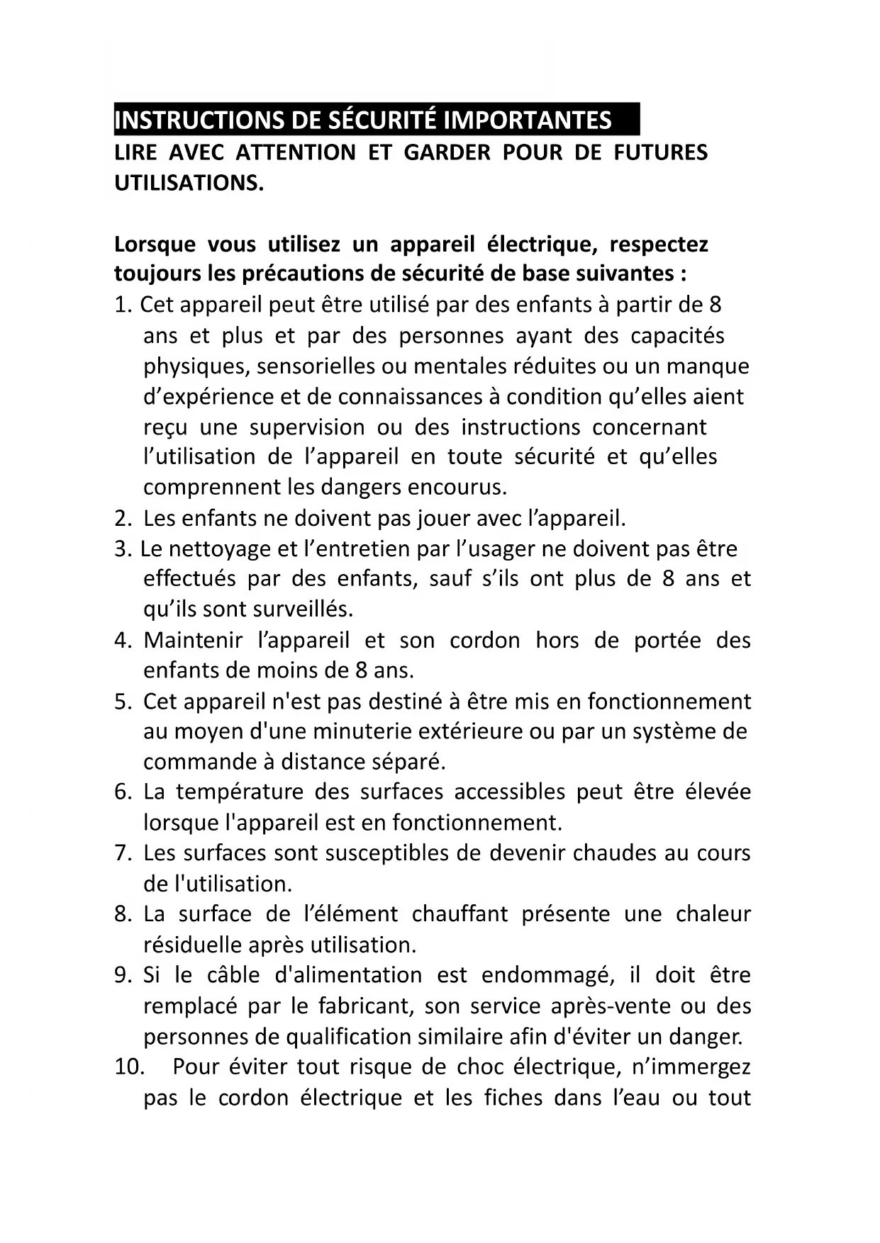 Guide d’utilisation – Instruction bookletINSTRUCTIONS DE SÉCURITÉ IMPORTANTES LIRE AVEC ATTENTION ET GARDER POUR DE FUTURES UTILISATIONS. Lorsque vous utilisez un appareil électrique, respectez toujours les précautions de sécurité de base suivantes :