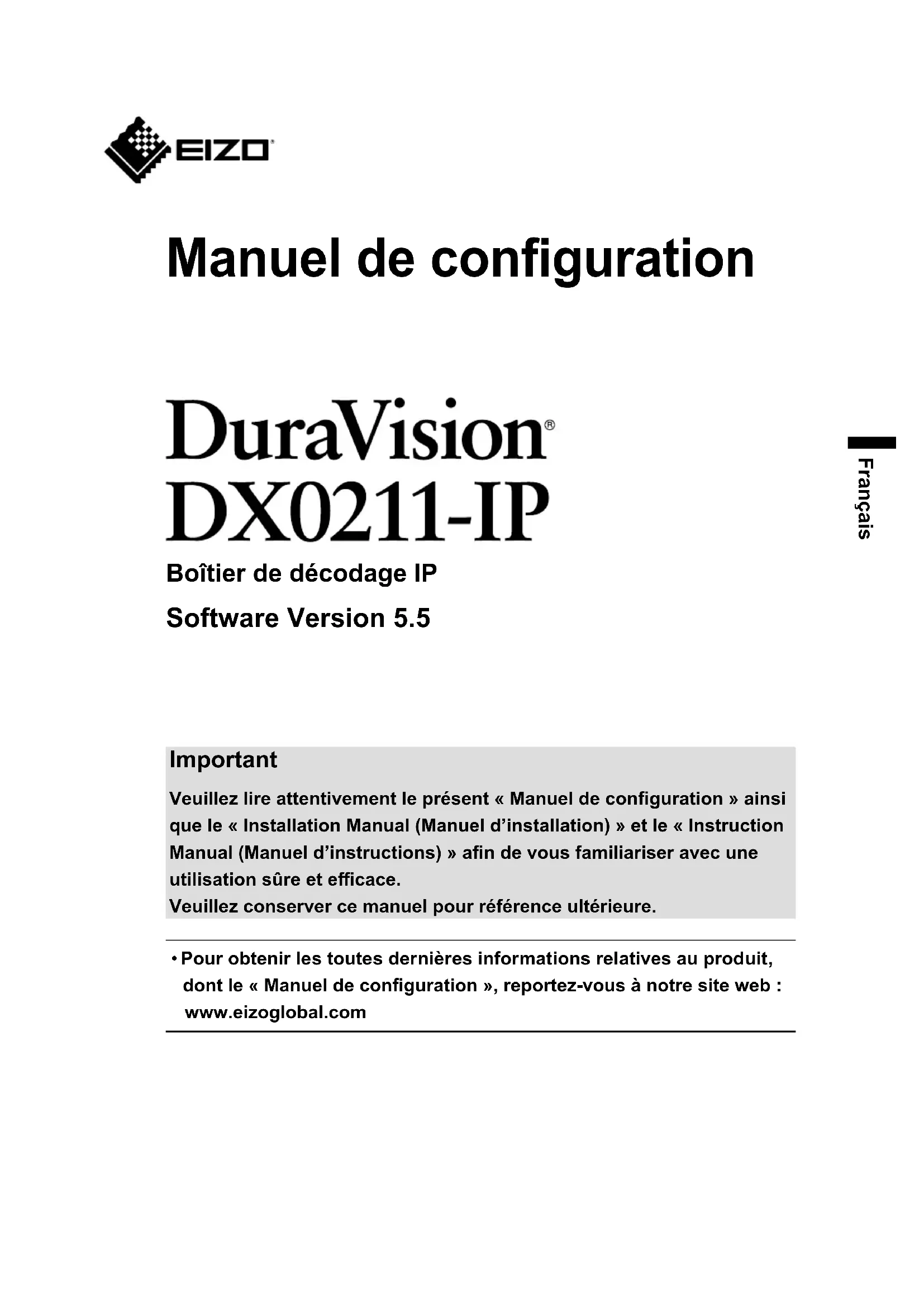 Décrit le fonctionnement des menus de l’écran de l’image en direct. (Conseils sur le fonctionnement) *1 Vous pouvez obtenir sur notre site Web le Instruction Manual (Manuel d’instructions) et le Installation Manual (Manuel d’installation) pour la version la plus récente du logiciel utilisée. Sélectionnez « Manuals (Manuels) » dans « Support (Assistance) », entrez « DX0211-IP » dans la boîte de dialogue « Enter model name (Entrer le nom du modèle) », puis cliquez sur « Search (Rechercher) ». www.eizoglobal.com Installation du logiciel Adobe Acrobat Reader nécessaire. Ce produit a été spécialement réglé pour l’utilisation dans la région dans laquelle il a d’abord été livré. Si utilisé en dehors de cette région, le produit pourrait ne pas fonctionner comme indiqué dans les spécications. Aucune partie de ce manuel ne peut être reproduite, enregistrée dans un système documentaire ou transmise sous quelque forme et par quelque moyen que ce soit électronique, mécanique ou autre, sans l’autorisation écrite préalable de EIZO Corporation. EIZO Corporation n’est tenu à aucun engagement de condentialité sauf en cas d’accord préalable passé avant la réception de ces informations par EIZO Corporation. Malgré tous les eorts déployés pour garantir la mise à jour des informations contenues dans ce manuel, veuillez noter que les caractéristiques techniques du produit EIZO sont sujettes à modication sans préavis.Français