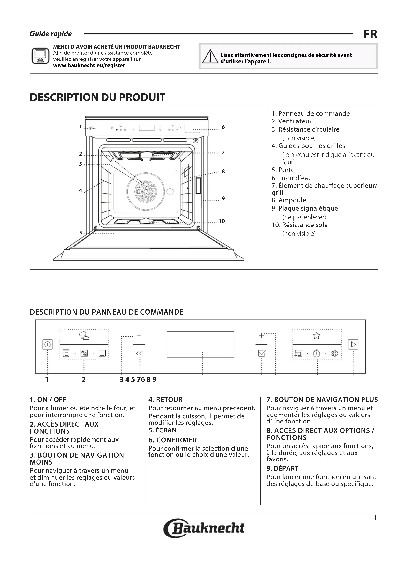 MERCI D’AVOIR ACHETÉ UN PRODUIT BAUKNECHTAn de proter d’une assistance complète, veuillez enregistrer votre appareil sur www . bauknecht . eu / registerLisez attentivement les consignes de sécurité avant d’utiliser l’appareil.2 ACCESSOIRES GRILLE MÉTALLIQUE LÈCHEFRITE PLAQUE DE CUISSON GRILLES COULISSANTES * Utilisées pour la cuisson des aliments ou comme support pour les lèchefrites, moules à gâteau, et autres plats de cuisson résistants à la chaleur Utiliser comme plat de cuisson pour la viande, le poisson, les légumes, la focaccia, etc., ou pour recueillir les jus de cuisson en la plaçant sous la grille métallique. Pour la cuisson du pain et des pâtisseries, mais aussi pour cuire des rôtis, du poisson en papillotes, etc. Pour insérer ou enlever les accessoires plus facilement. PANIER VAPEUR Il facilite la circulation de la vapeur pour obtenir une cuisson uniforme. Placez la lèchefrite en dessous pour recueillir les jus de cuisson. **
