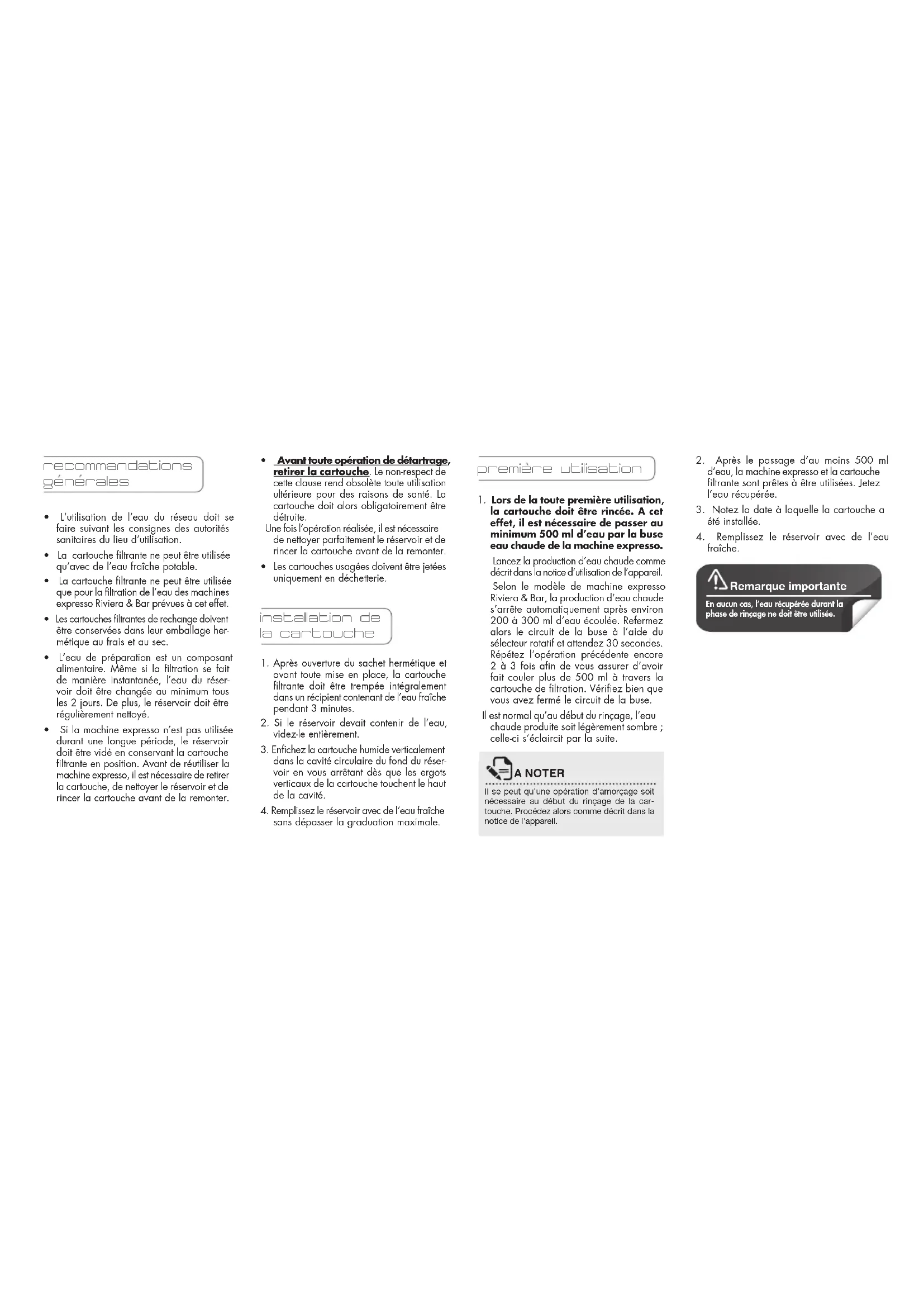- La cartouche filtrante ne peut être utilisée que pour la filtration de l’eau des machines expresso Riviera & Bar prévues à cet effet.