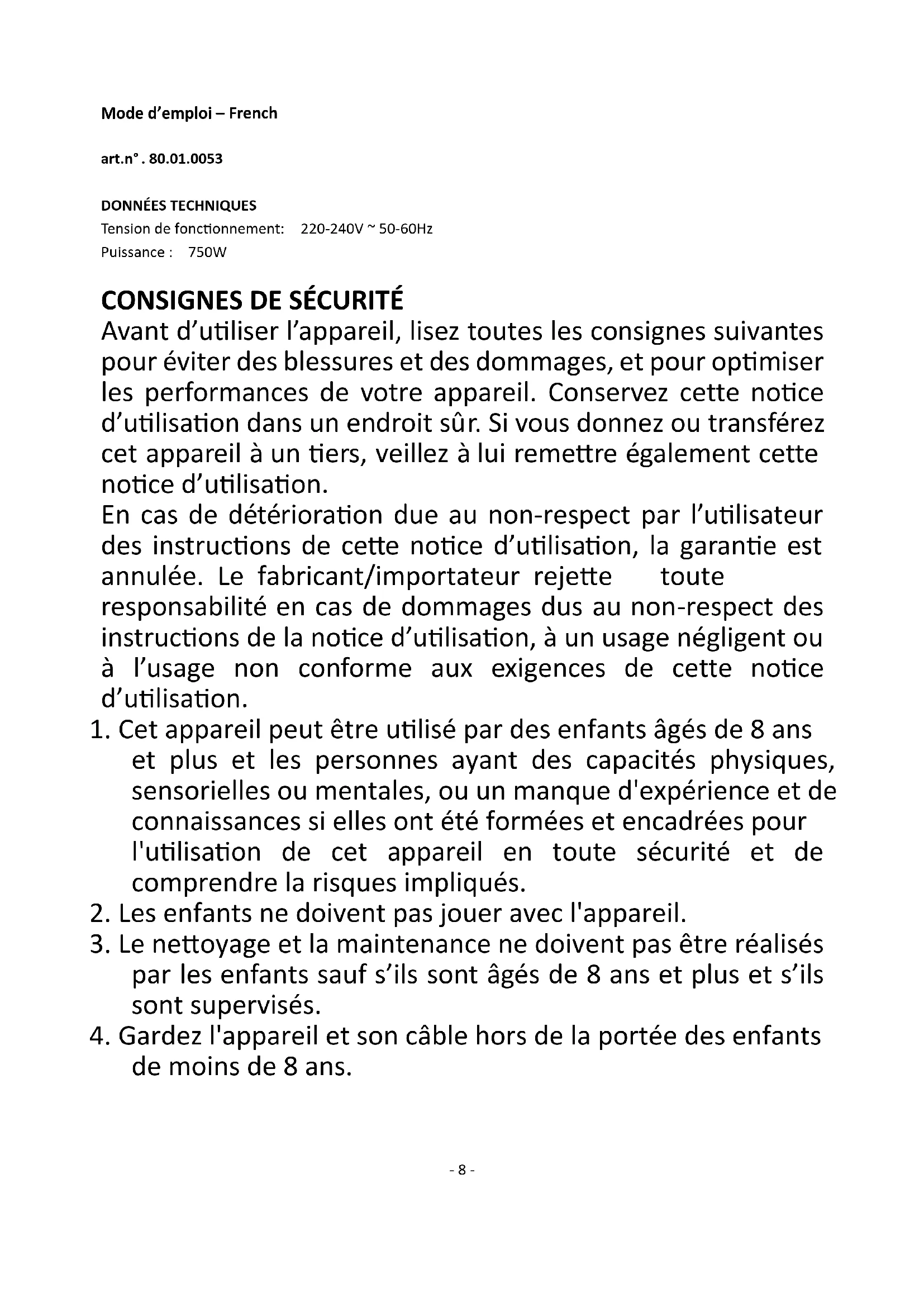 Avant d’utiliser l’appareil, lisez toutes les consignes suivantes pour éviter des blessures et des dommages, et pour optimiser les performances de votre appareil. Conservez cette notice d’utilisation dans un endroit sûr. Si vous donnez ou transférez cet appareil à un tiers, veillez à lui remettre également cette notice d’utilisation. En cas de détérioration due au non-respect par l’utilisateur des instructions de cette notice d’utilisation, la garantie est annulée. Le fabricant/importateur rejette toute responsabilité en cas de dommages dus au non-respect des instructions de la notice d’utilisation, à un usage négligent ou à l’usage non conforme aux exigences de cette notice d’utilisation.