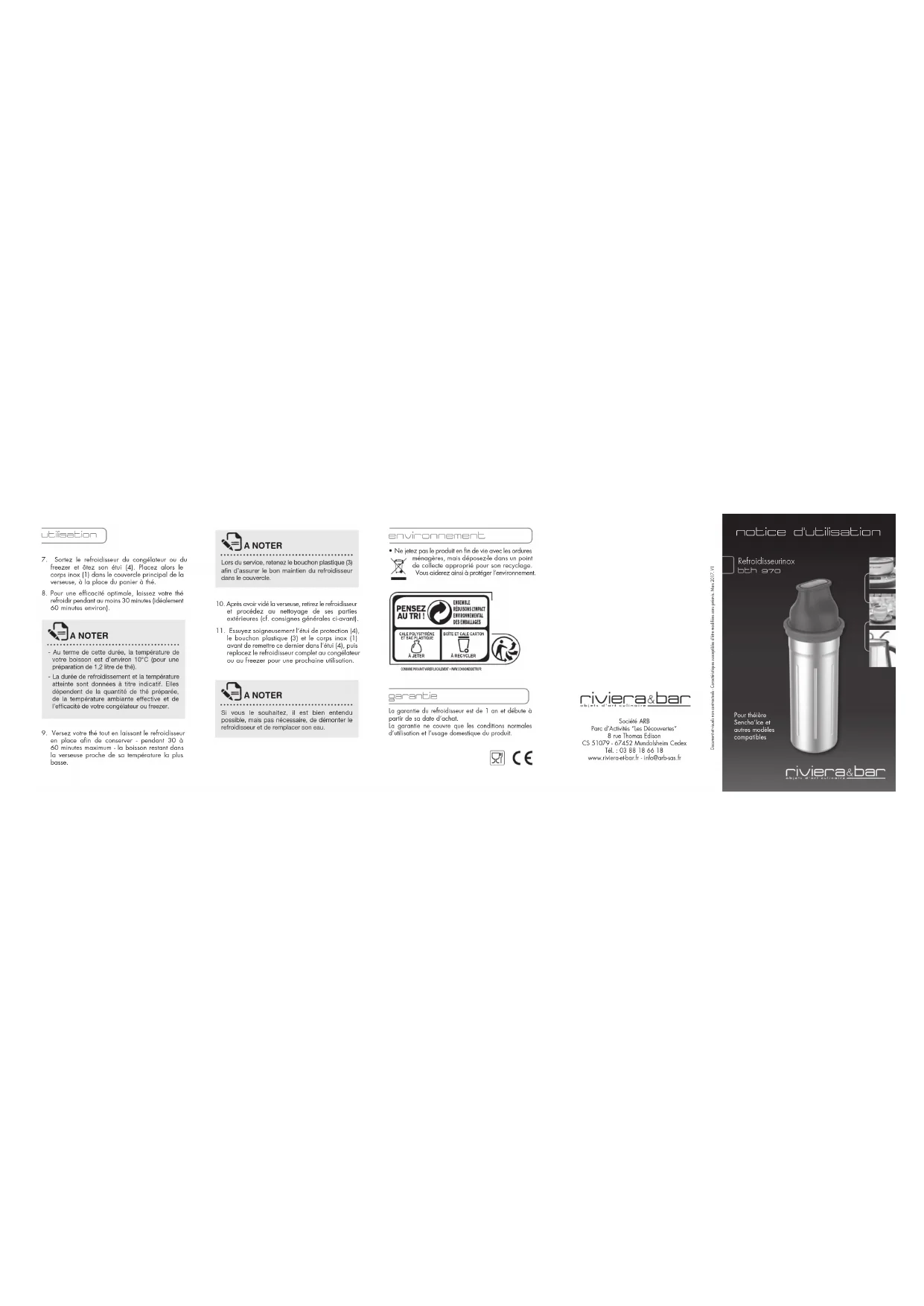 Ne jetez pas le produit en fin de vie avec les ordures ménagères, mais déposez-le dans un point de collecte approprié pour son recyclage. Vous aiderez ainsi à protéger l’environnement.CONSIGNE POUVANT VARIER LOCALEMENT > WWW.CONSIGNESDETRI.FRÀ JETERCALE POLYSTYRÈNEET SAC PLASTIQUEBOÎTE ET CALE CARTONÀ RECYCLERLa garantie du refroidisseur est de 1 an et débute à partir de sa date d’achat.La garantie ne couvre que les conditions normales d’utilisation et l’usage domestique du produit.Pour théière Sencha’Ice et autres modèles compatibles garantie - Au terme de cette durée, la température de votre boisson est d’environ 10°C (pour une préparation de 1,2 litre de thé).- La durée de refroidissement et la température atteinte sont données à titre indicatif. Elles dépendent de la quantité de thé préparée, de la température ambiante effective et de l’efficacité de votre congélateur ou freezer. A noter utilisation Société ARB Parc d’Activités “Les Découvertes” 8 rue Thomas Edison CS 51079 - 67452 Mundolsheim Cedex Tél. : 03 88 18 66 18 www.riviera-et-bar.fr - info@arb-sas.fr Document et visuels non contractuels - Caractéristiques susceptibles d’être modifiées sans préavis. Mars 2017. V1description du produit description du produit