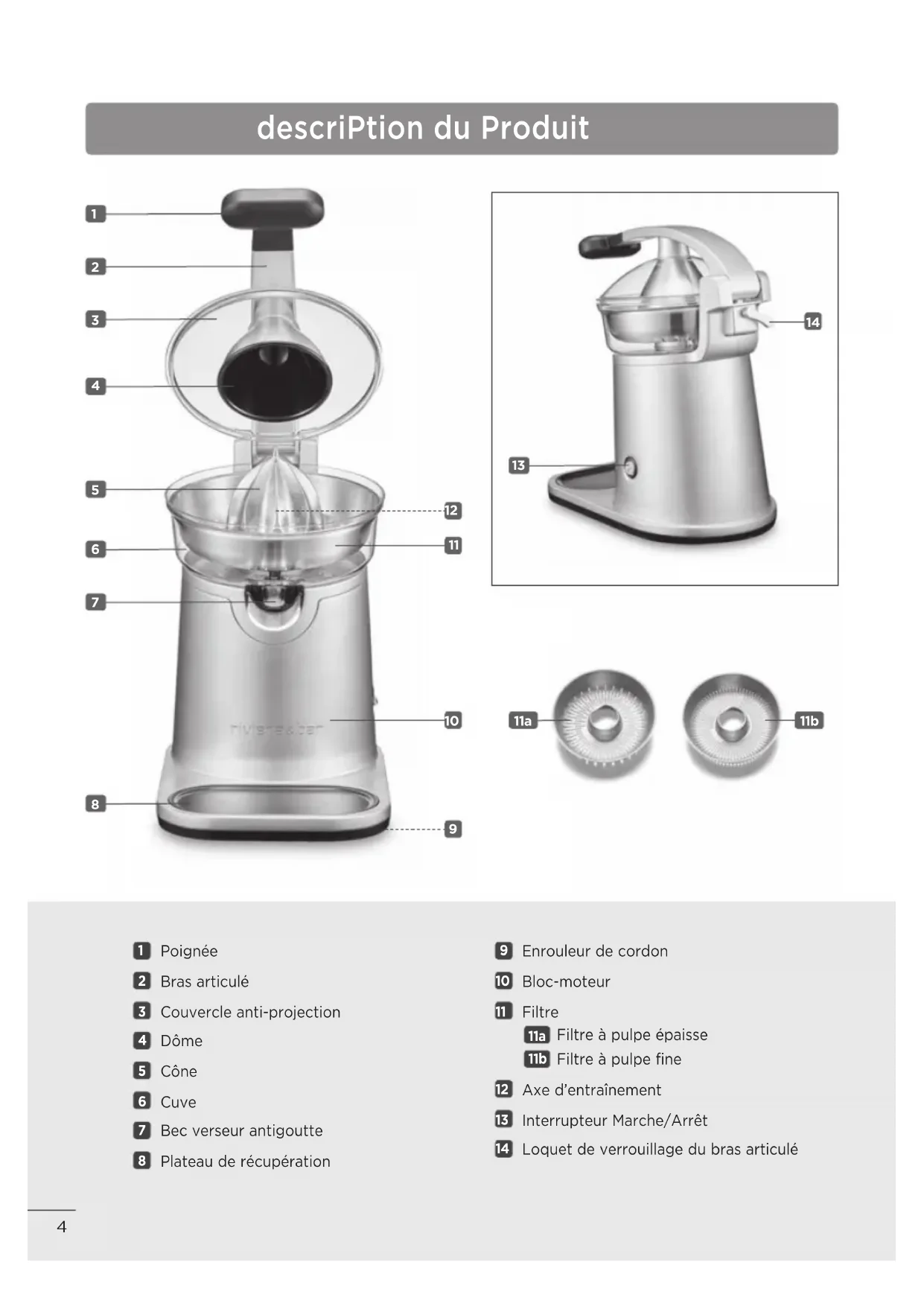 tué à l’aide d’une brosse douce pour extirper les éventuelles fibres alimentaires. - Avant tout nettoyage ou entretien, l’appareil doit être débranché. - N’immergez en aucun cas le bloc-moteur et le cordon d’alimentation dans l’eau ou dans quelque liquide que ce soit. - Ne lavez jamais le bloc-moteur à l’eau courante. - Seuls les filtres sont compatibles lave-vaisselle. - N’utilisez pas de produits chimiques ou de nettoyants abrasifs ou de laine d’acier pour nettoyer les différentes pièces de l’appareil. Remarques importantes