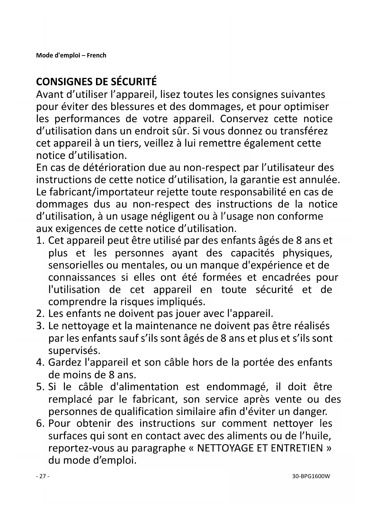 19. Cet appareil n’est pas conçu pour un usage commercial.- 29 - 30-BPG1600W