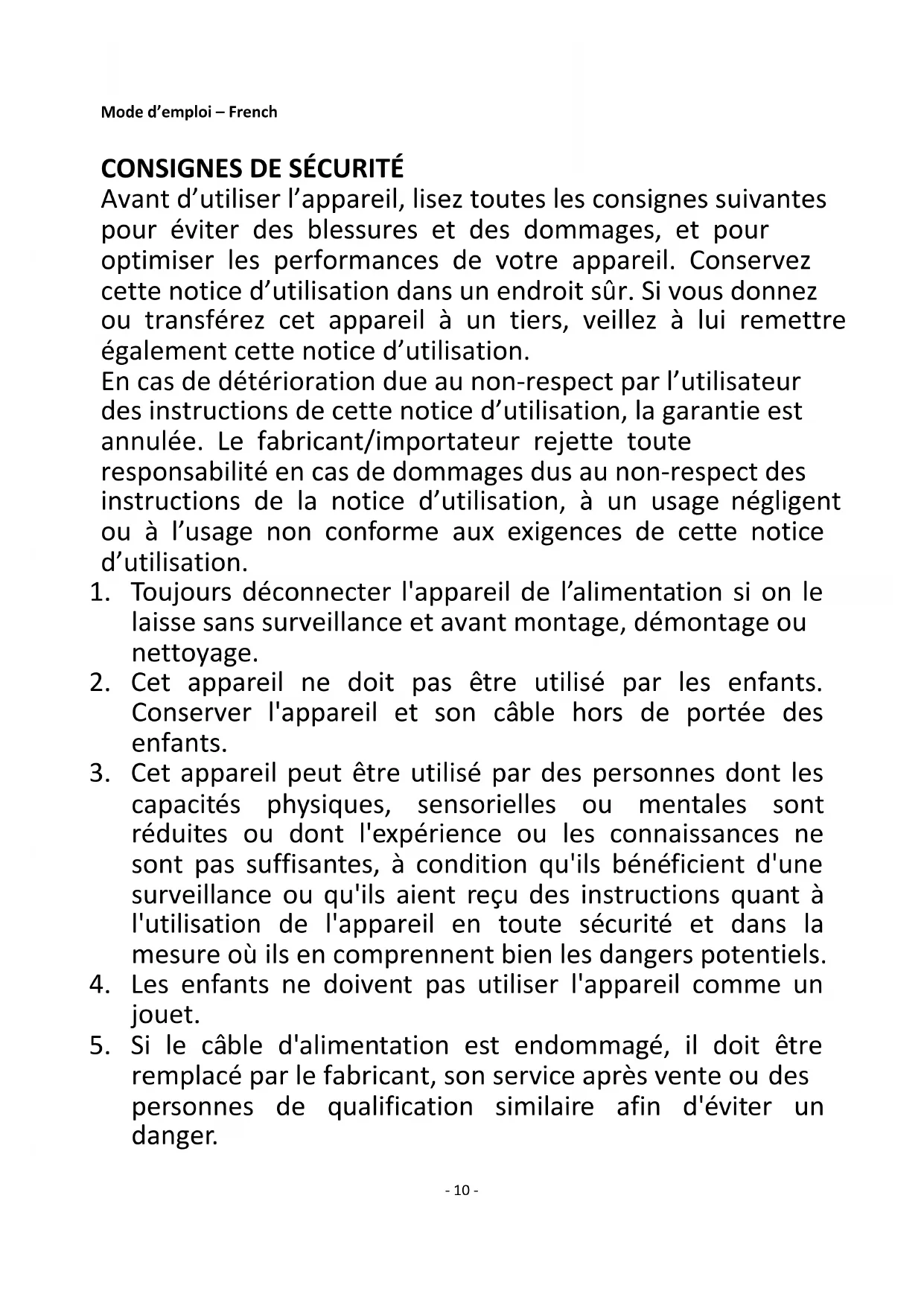 Avant d’utiliser l’appareil, lisez toutes les consignes suivantes pour éviter des blessures et des dommages, et pour optimiser les performances de votre appareil. Conservez cette notice d’utilisation dans un endroit sûr. Si vous donnez ou transférez cet appareil à un tiers, veillez à lui remettre également cette notice d’utilisation. En cas de détérioration due au non-respect par l’utilisateur des instructions de cette notice d’utilisation, la garantie est annulée. Le fabricant/importateur rejette toute responsabilité en cas de dommages dus au non-respect des instructions de la notice d’utilisation, à un usage négligent ou à l’usage non conforme aux exigences de cette notice d’utilisation.