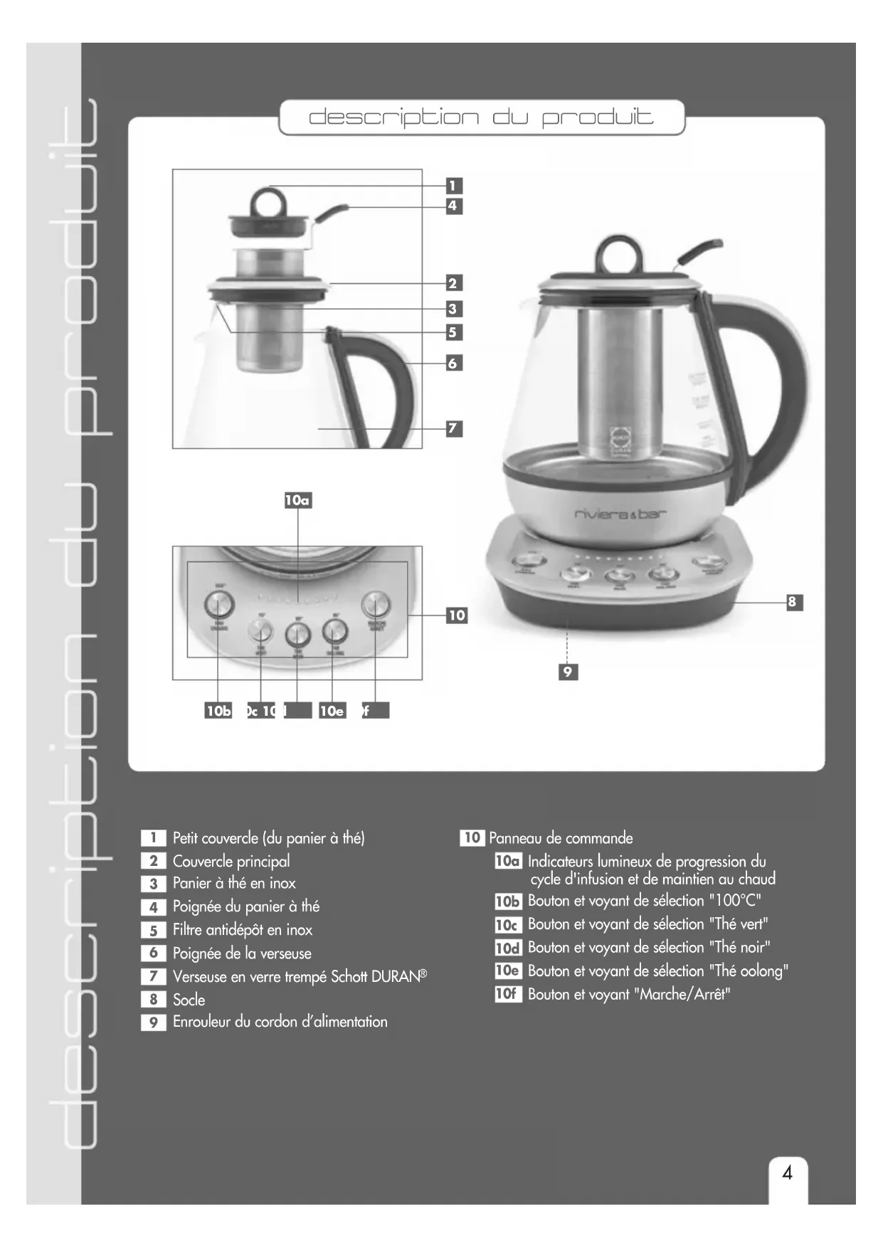 Panneau de commande 10a Indicateurs lumineux de progression du cycle d'infusion et de maintien au chaud 10b Bouton et voyant de sélection "100°C" 10c Bouton et voyant de sélection "Thé vert" 10d Bouton et voyant de sélection "Thé noir" 10e Bouton et voyant de sélection "Thé oolong" 10f Bouton et voyant "Marche/Arrêt" description du produit