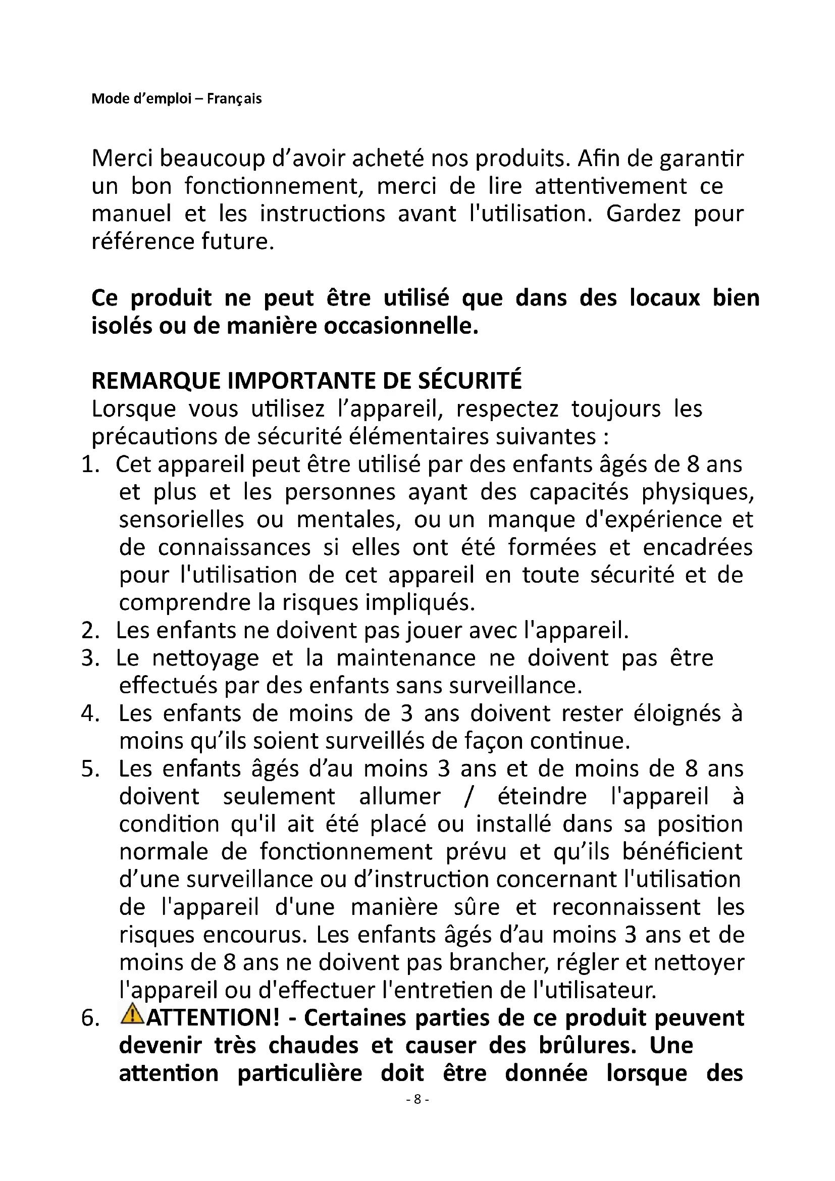 devenir très chaudes et causer des brûlures. Une attention particulière doit être donnée lorsque des- 9 - enfants ou des enfants vulnérables sont présents.