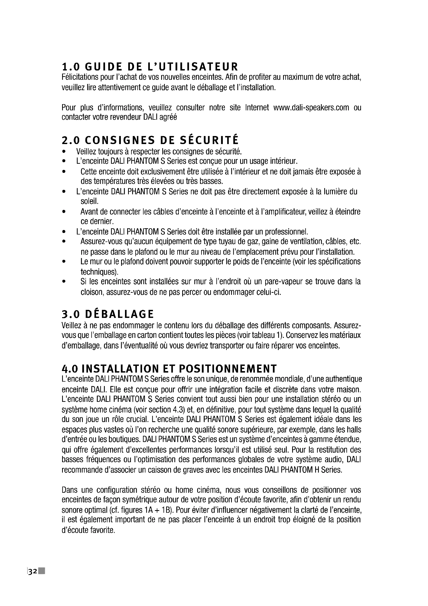 L’enceinte DALI PHANTOM S Series offre le son unique, de renommée mondiale, d’une authentique enceinte DALI. Elle est conçue pour offrir une intégration facile et discrète dans votre maison. L’enceinte DALI PHANTOM S Series convient tout aussi bien pour une installation stéréo ou un système home cinéma (voir section 4.3) et, en définitive, pour tout système dans lequel la qualité du son joue un rôle crucial. L’enceinte DALI PHANTOM S Series est également idéale dans les espaces plus vastes où l’on recherche une qualité sonore supérieure, par exemple, dans les halls d’entrée ou les boutiques. DALI PHANTOM S Series est un système d’enceintes à gamme étendue, qui offre également d’excellentes performances lorsqu’il est utilisé seul. Pour la restitution des basses fréquences ou l’optimisation des performances globales de votre système audio, DALI recommande d’associer un caisson de graves avec les enceintes DALI PHANTOM H Series. Dans une configuration stéréo ou home cinéma, nous vous conseillons de positionner vos enceintes de façon symétrique autour de votre position d’écoute favorite, afin d’obtenir un rendu sonore optimal (cf. figures 1A + 1B). Pour éviter d’influencer négativement la clarté de l’enceinte, il est également important de ne pas placer l’enceinte à un endroit trop éloigné de la position d’écoute favorite.UK DE DK CN FR
