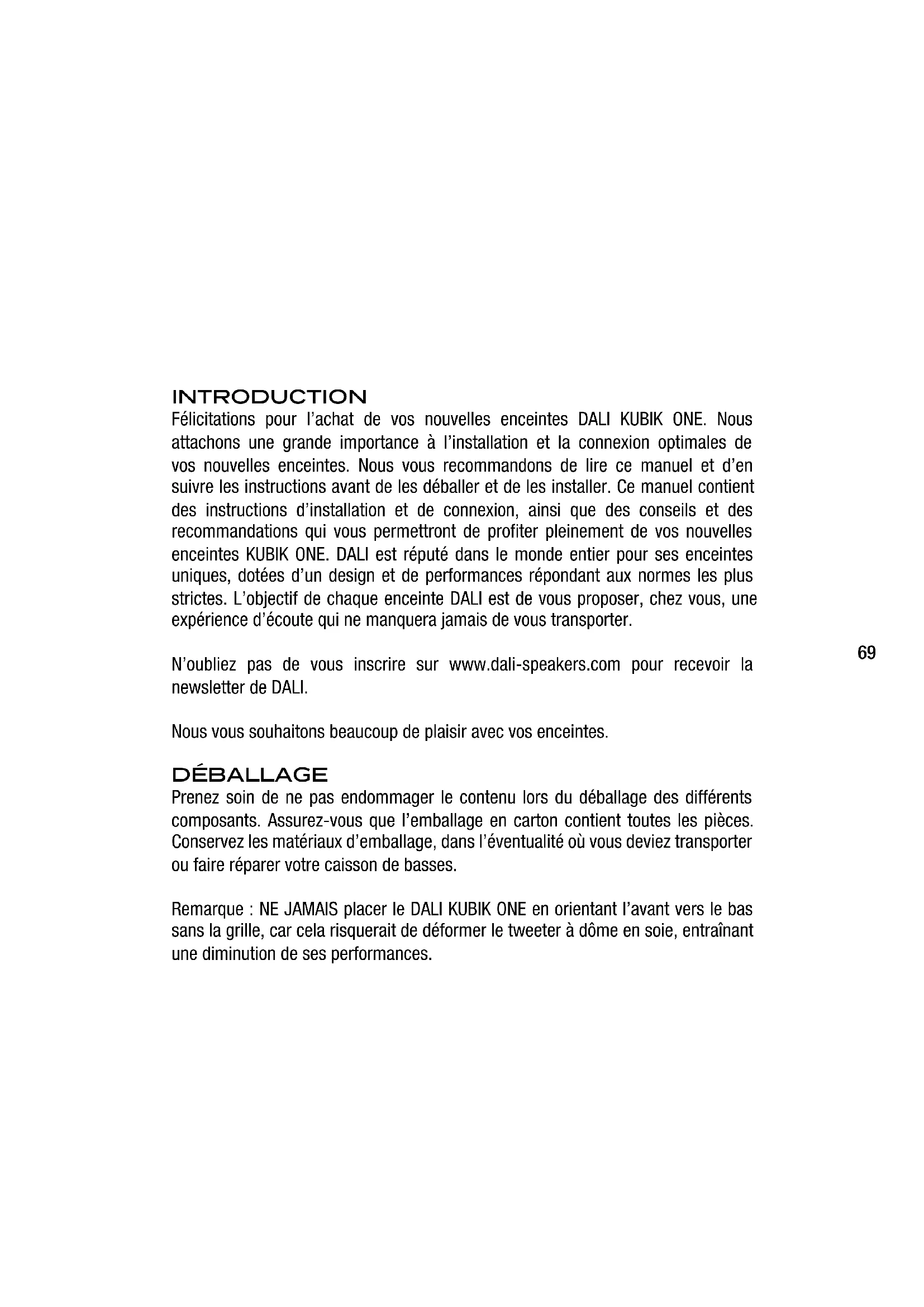 LECTurE ANNExES COMMANDES68 KUBIK ONE KUBIK Remote Power cable CONTENu DE LA bOÎTE69 INTrODuCTION Félicitations pour l’achat de vos nouvelles enceintes DALI KUBIK ONE. Nous attachons une grande importance à l’installation et la connexion optimales de vos nouvelles enceintes. Nous vous recommandons de lire ce manuel et d’en suivre les instructions avant de les déballer et de les installer. Ce manuel contient des instructions d’installation et de connexion, ainsi que des conseils et des recommandations qui vous permettront de profiter pleinement de vos nouvelles enceintes KUBIK ONE. DALI est réputé dans le monde entier pour ses enceintes uniques, dotées d’un design et de performances répondant aux normes les plus strictes. L’objectif de chaque enceinte DALI est de vous proposer, chez vous, une expérience d’écoute qui ne manquera jamais de vous transporter. N’oubliez pas de vous inscrire sur www.dali-speakers.com pour recevoir la newsletter de DALI. Nous vous souhaitons beaucoup de plaisir avec vos enceintes. DÉbALLAgE Prenez soin de ne pas endommager le contenu lors du déballage des différents composants. Assurez-vous que l’emballage en carton contient toutes les pièces. Conservez les matériaux d’emballage, dans l’éventualité où vous deviez transporter ou faire réparer votre caisson de basses. Remarque : NE JAMAIS placer le DALI KUBIK ONE en orientant l’avant vers le bas sans la grille, car cela risquerait de déformer le tweeter à dôme en soie, entraînant une diminution de ses performances.70 CONNExIONS CONNExIONS Connecteur USB Connectez un câble Micro USB au KUBIK ONE. Remarque: L’entrée Micro USB ne fonctionne qu’avec un PC ou un MAC (ipad en cas d’utilisation avec le kit de connexion à un appareil photo Apple). Connecteur optique Connectez un câble optique (toSLINK) au KUBIK ONE. Connecteur optique Connectez un câble optique (toSLINK) au KUBIK ONE. Connecteur AUX Connectez une source analogique via un câble RCA (cinch). Connecteur caisson de basse Connectez un caisson de basse actif au KUBIK ONE. Le KUBIK ONE active automatiquement la sortie de caisson de basse lorsque le câble est connecté.