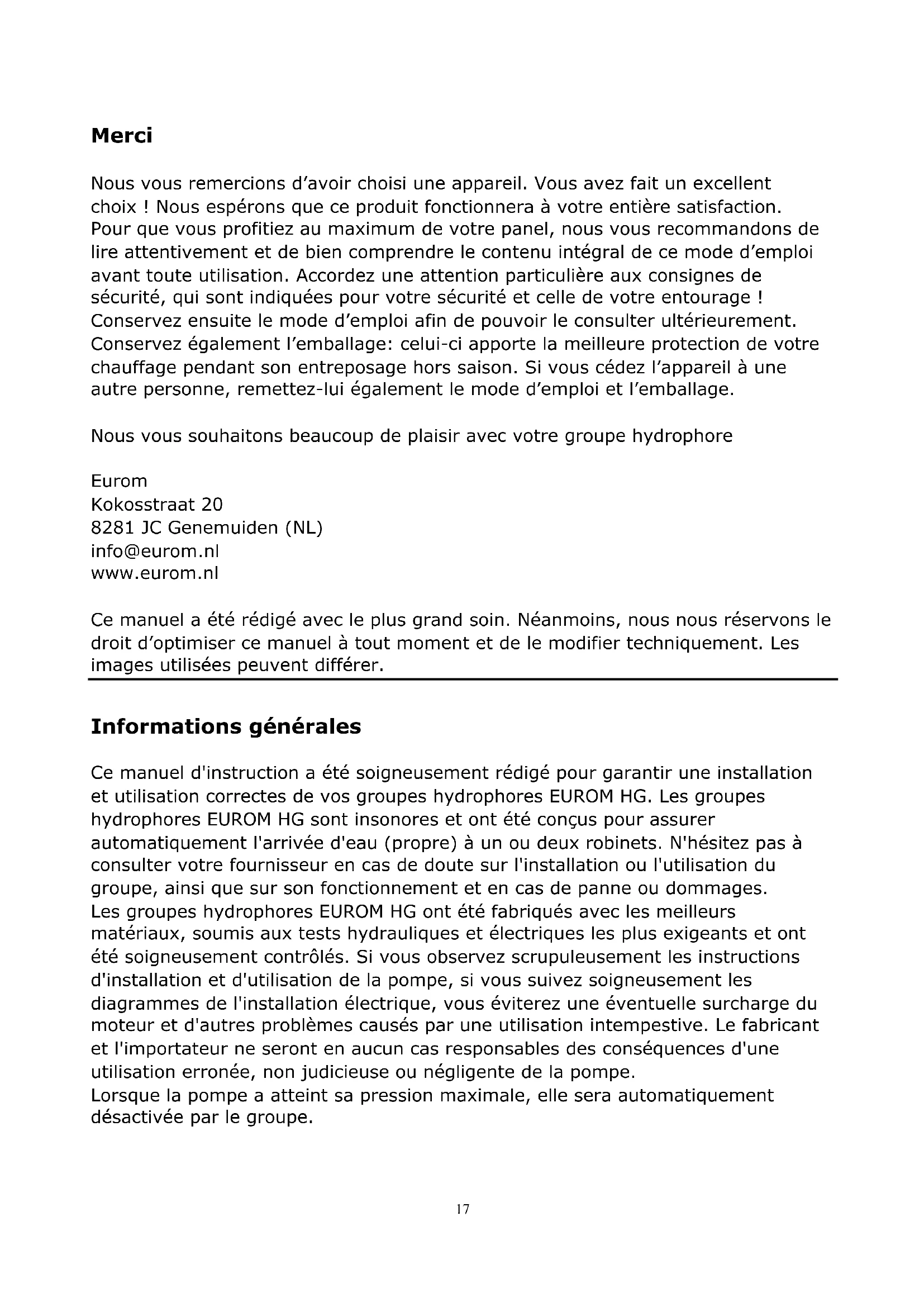 Sie, ob die Grundeinstellungen korrekt sind. Wenn andere als die oben genannten Störungen auftreten oder wenn die vorgeschlagenen Lösungen das Problem nicht lösen, wenden Sie sich bitte an Ihren Kundendienst.16 Entsorgung Innerhalb der EU weist dieses Symbol darauf hin, dass dieses Produkt nicht mit dem gewöhnlichen Hausmüll entsorgt werden darf. Altgeräte enthalten wertvolle Stoffe, die verwertet werden können und müssen, um die Umwelt und die Gesundheit der Menschen nicht durch eine unkontrollierte Müllsammlung zu schädigen. Bringen Sie Altgeräte daher zu einer dafür vorgesehe- nen Deponie oder wenden Sie sich an das Geschäft, wo Sie das Gerät gekauft haben. Diese können dafür sorgen, dass möglichst viele Teile des Geräts wiederverwendet werden. CE-Deklaration Sehe Seite 39.17 Merci Nous vous remercions d’avoir choisi une appareil. Vous avez fait un excellent choix ! Nous espérons que ce produit fonctionnera à votre entière satisfaction. Pour que vous profitiez au maximum de votre panel, nous vous recommandons de lire attentivement et de bien comprendre le contenu intégral de ce mode d’emploi avant toute utilisation. Accordez une attention particulière aux consignes de sécurité, qui sont indiquées pour votre sécurité et celle de votre entourage ! Conservez ensuite le mode d’emploi afin de pouvoir le consulter ultérieurement. Conservez également l’emballage: celui-ci apporte la meilleure protection de votre chauffage pendant son entreposage hors saison. Si vous cédez l’appareil à une autre personne, remettez-lui également le mode d’emploi et l’emballage. Nous vous souhaitons beaucoup de plaisir avec votre groupe hydrophore Eurom Kokosstraat 20 8281 JC Genemuiden (NL) info@eurom.nl www.eurom.nl Ce manuel a été rédigé avec le plus grand soin. Néanmoins, nous nous réservons le droit d’optimiser ce manuel à tout moment et de le modifier techniquement. Les images utilisées peuvent différer.