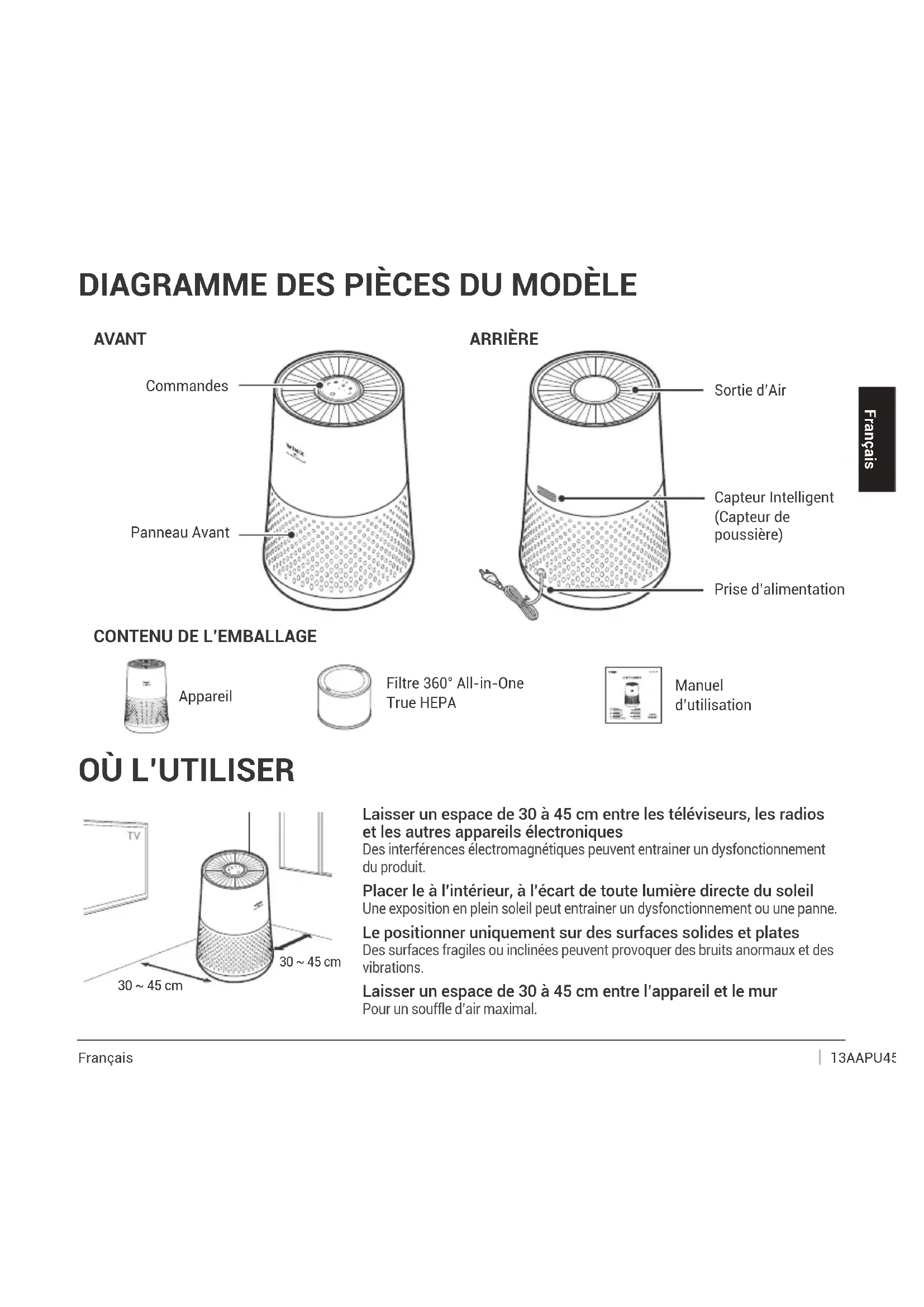 Commandes Sortie d’Air Panneau Avant Capteur Intelligent (Capteur de poussière) Prise d’alimentation ARRIÈRE Appareil Filtre 360° All-in-One True HEPA Manuel d’utilisation 30 ~ 45 cm30 ~ 45 cm FrançaisFrançais Français