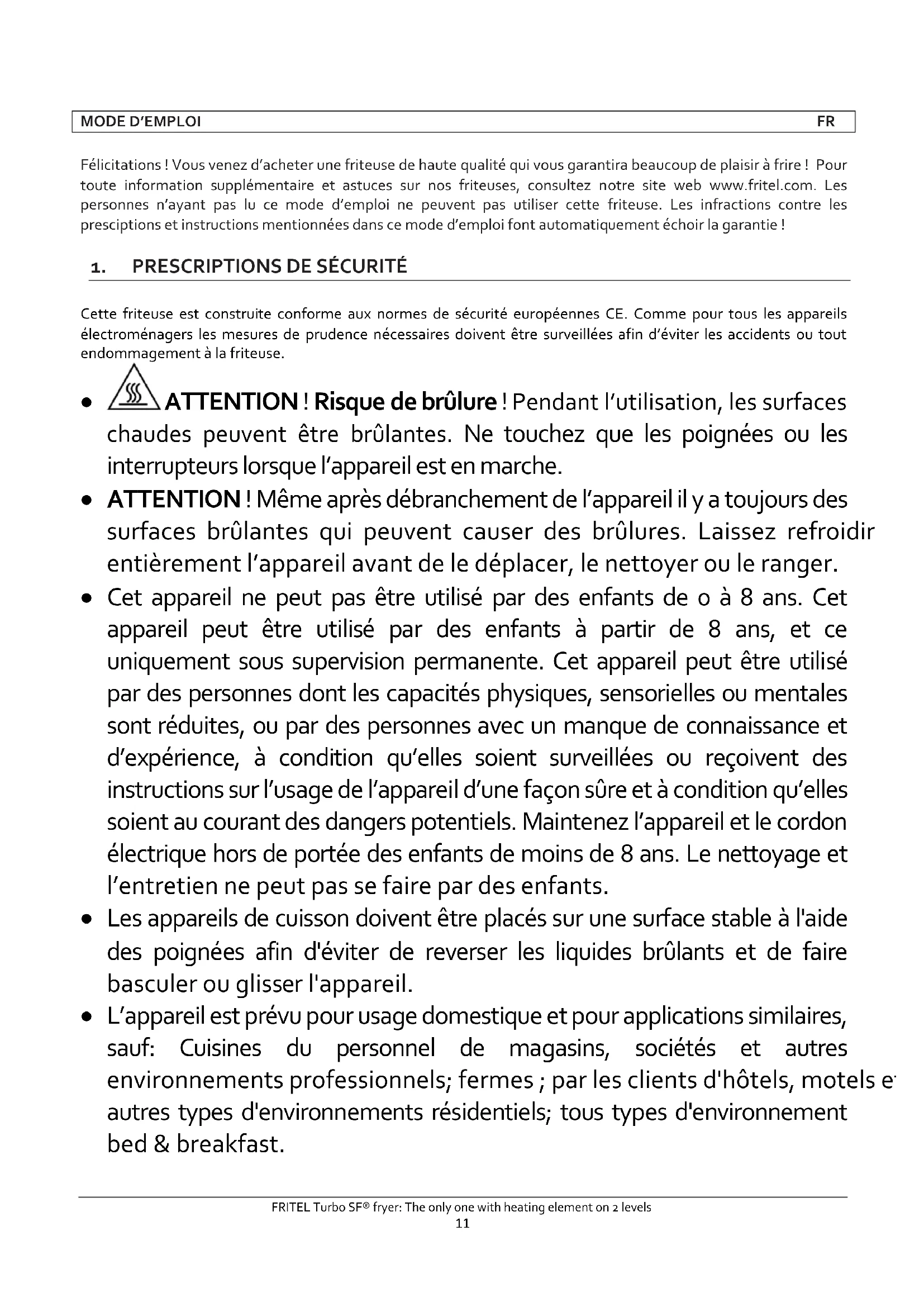 - L’appareil est prévu pour usage domestique et pour applications similaires, sauf: Cuisines du personnel de magasins, sociétés et autres environnements professionnels; fermes ; par les clients d'hôtels, motels et autres types d'environnements résidentiels; tous types d'environnement bed & breakfast.FRITEL Turbo SF® fryer: The only one with heating element on 2 levels