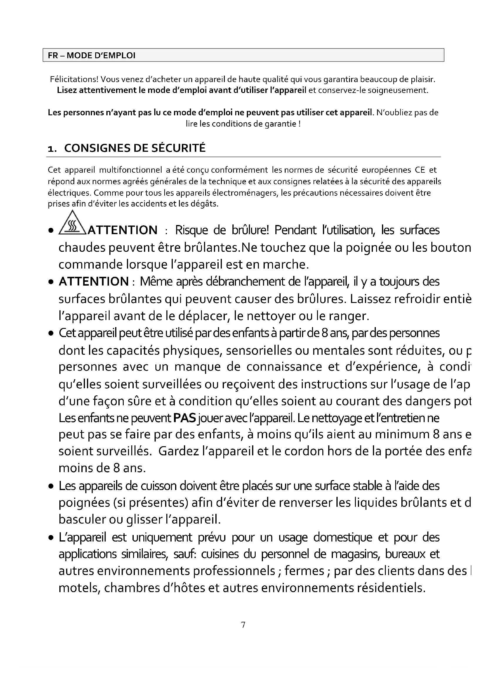 Cet appareil multifonctionnel a été conçu conformément les normes de sécurité européennes CE et répond aux normes agréés générales de la technique et aux consignes relatées à la sécurité des appareils électriques. Comme pour tous les appareils électroménagers, les précautions nécessaires doivent être prises afin d’éviter les accidents et les dégâts.