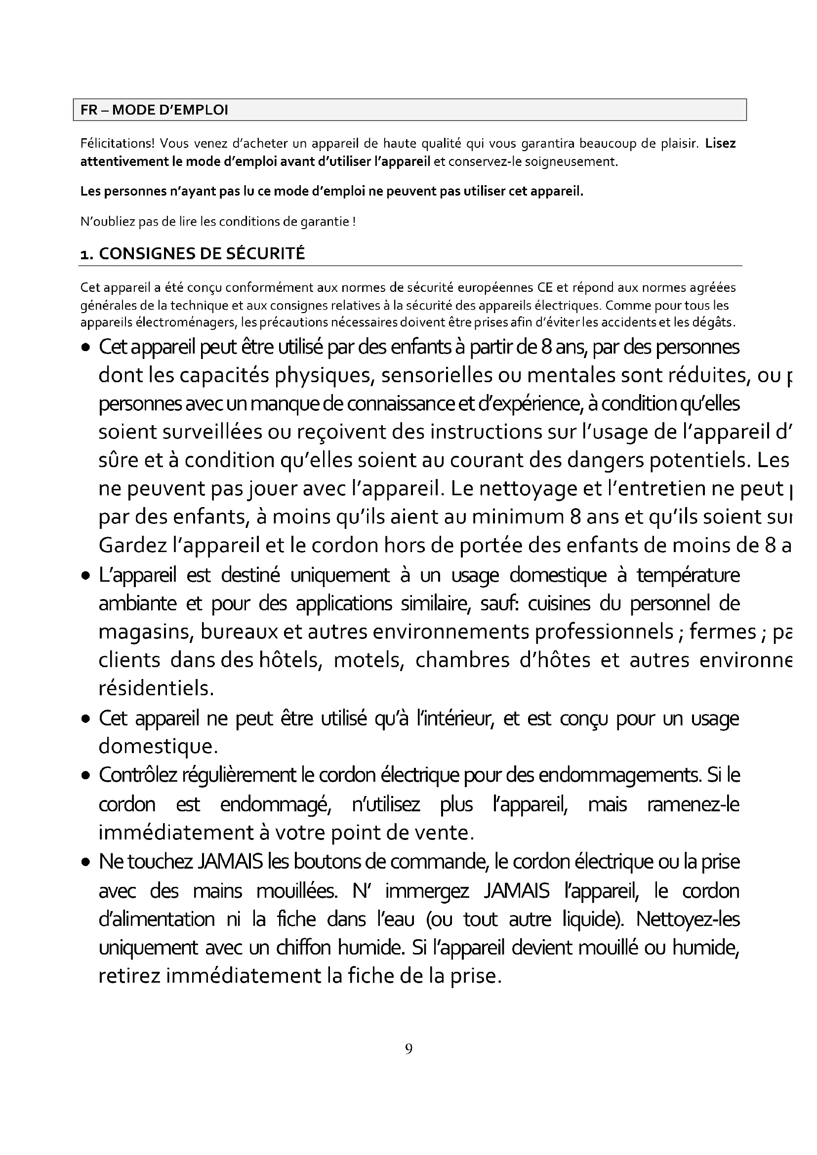Cet appareil a été conçu conformément aux normes de sécurité européennes CE et répond aux normes agréées générales de la technique et aux consignes relatives à la sécurité des appareils électriques. Comme pour tous les appareils électroménagers, les précautions nécessaires doivent être prises afin d’éviter les accidents et les dégâts.