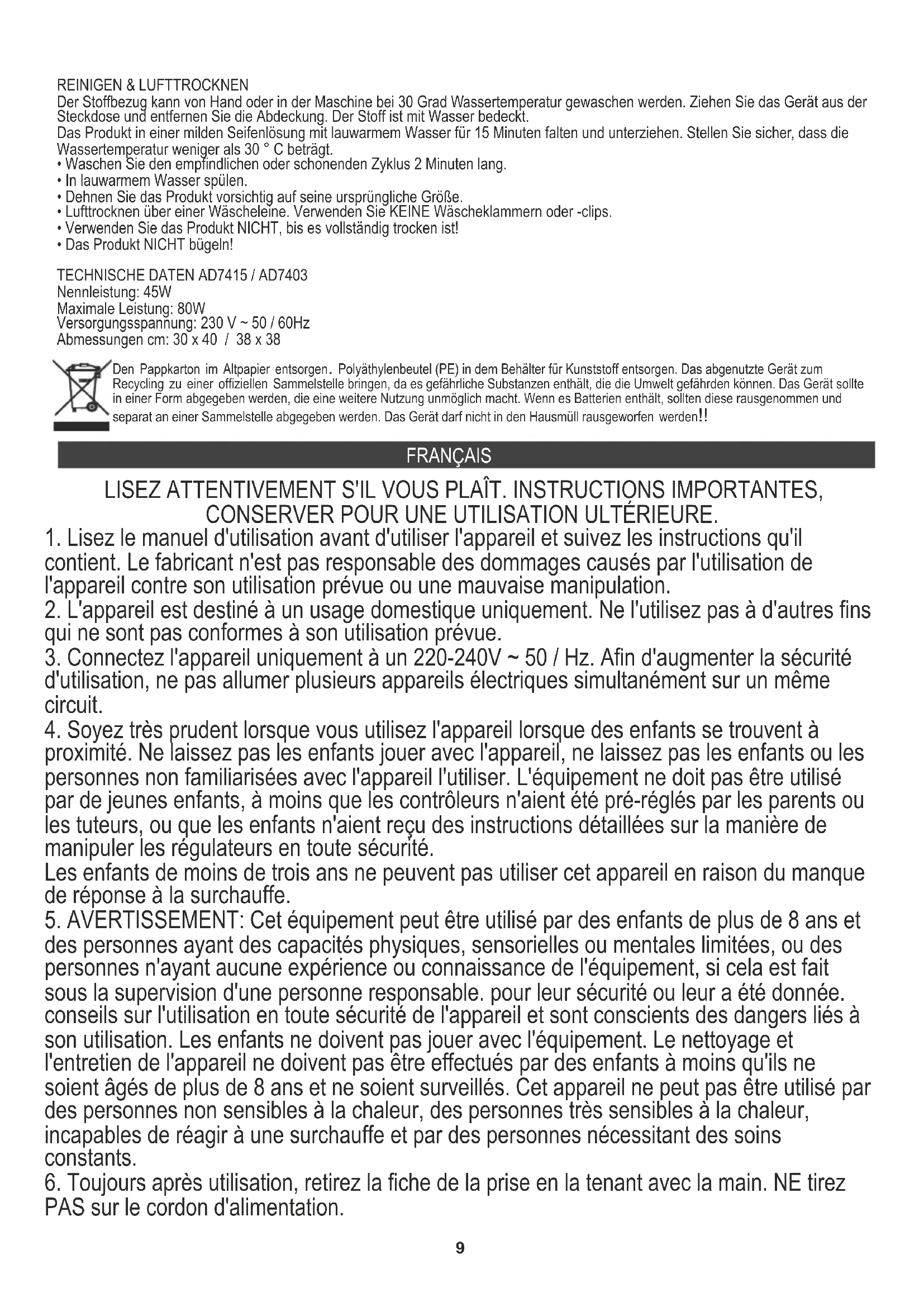 13. Seules les parties du produit indiquées dans les instructions peuvent être repassées à une température allant jusqu'à 110 ° C. 14. N'utilisez pas l'appareil près de l'eau, par exemple: sous la douche, dans la baignoire ou au-dessus du lavabo avec de l'eau. Produit: Coussin chauffant électrique AD7415 / AD7403