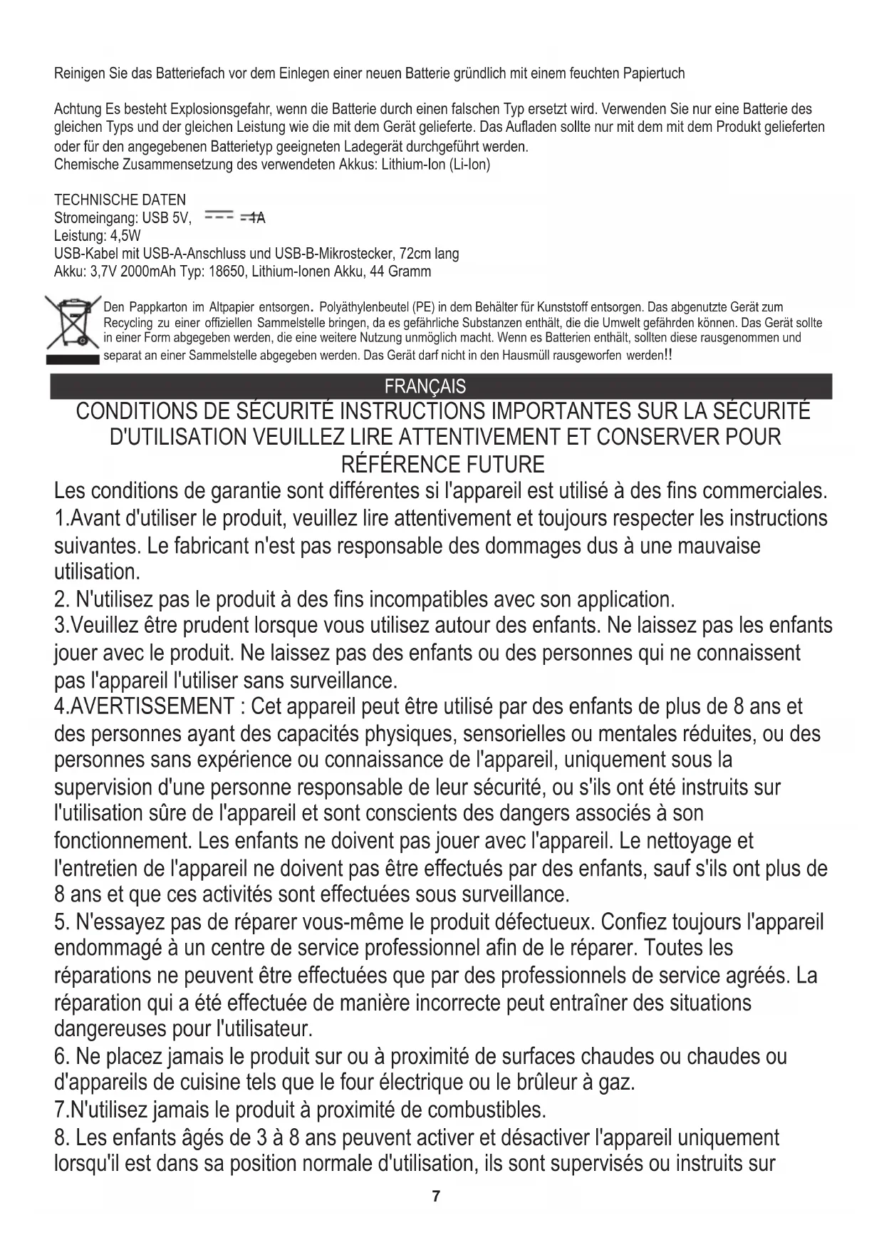 3.Utilisez uniquement un chiffon sec et doux pour le nettoyage. N'utilisez pas de produits de nettoyage et de produits chimiques. Pour enlever la poussière des grilles, vous pouvez occasionnellement les essuyer avec une brosse. 4. Stockez le produit hors de portée des enfants et dans un endroit sec et à l'abri de la poussière lorsqu'il n'est pas utilisé. Batterie rechargeable9 Respect de l'environnement. Nous vous prions de bien vouloir trier les emballages en carton ainsi que les sachets plastiques (en polyéthylène). L'appareil usagé ne doit pas être jeté à la poubelle mais remis au point de collecte prévu à cet effet car il contient des éléments pouvant être nocifs pour l'environnement. L'appareil électrique doit être remis de manière à limiter au maximum une éventuelle utilisation ultérieure. Si l'appareil contient des piles, il faut les retirer et les remettre à un autre point de collecte. Ne pas jeter l'appareil dans une poubelle de déchets ménagers !!! ESPAÑOL Informations de sécurité importantes sur la batterie rechargeable Ces précautions s'appliquent aux produits utilisant des piles rechargeables (piles rechargeables). La batterie peut fuir, surchauffer ou exploser si elle est mal manipulée. L'électrolyte libéré est une source de corrosion et peut être toxique. Peut causer des brûlures à la peau et aux yeux ; il est également nocif en cas d'ingestion. Pour réduire le risque de blessure :