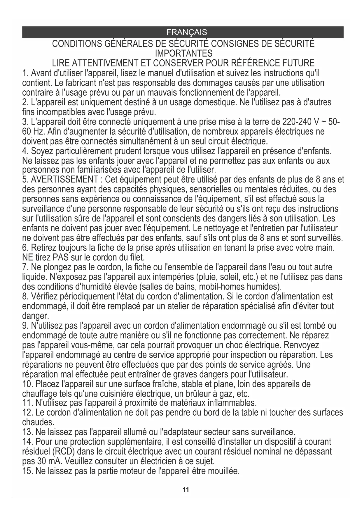 9. N'utilisez pas l'appareil avec un cordon d'alimentation endommagé ou s'il est tombé ou