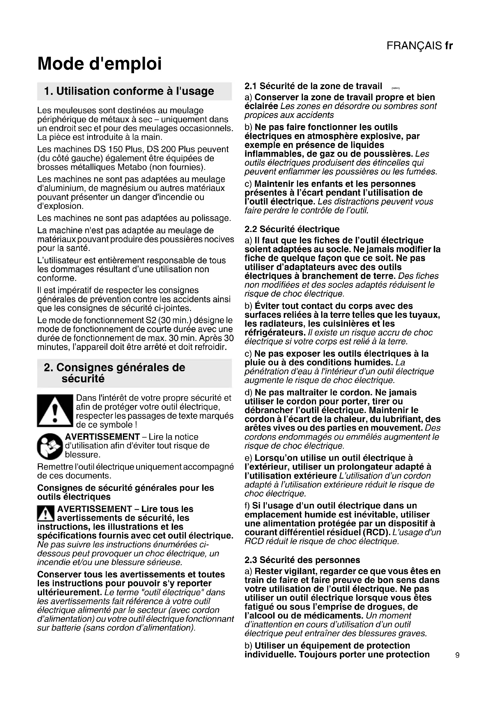Mode d'emploi Les meuleuses sont destinées au meulage périphérique de métaux à sec – uniquement dans un endroit sec et pour des meulages occasionnels. La pièce est introduite à la main. Les machines DS 150 Plus, DS 200 Plus peuvent (du côté gauche) également être équipées de brosses métalliques Metabo (non fournies). Les machines ne sont pas adaptées au meulage d'aluminium, de magnésium ou autres matériaux pouvant présenter un danger d'incendie ou d'explosion. Les machines ne sont pas adaptées au polissage. La machine n'est pas adaptée au meulage de matériaux pouvant produire des poussières nocives pour la santé. L’utilisateur est entièrement responsable de tous les dommages résultant d’une utilisation non conforme. Il est impératif de respecter les consignes générales de prévention contre les accidents ainsi que les consignes de sécurité ci-jointes. Le mode de fonctionnement S2 (30 min.) désigne le mode de fonctionnement de courte durée avec une durée de fonctionnement de max. 30 min. Après 30 minutes, l’appareil doit être arrêté et doit refroidir. Dans l'intérêt de votre propre sécurité et afin de protéger votre outil électrique, respecter les passages de texte marqués de ce symbole ! AVERTISSEMENT – Lire la notice d'utilisation afin d'éviter tout risque de blessure. Remettre l'outil électrique uniquement accompagné de ces documents. Consignes de sécurité générales pour les outils électriques AVERTISSEMENT – Lire tous les avertissements de sécurité, les instructions, les illustrations et les spécifications fournis avec cet outil électrique. Ne pas suivre les instructions énumérées ci- dessous peut provoquer un choc électrique, un incendie et/ou une blessure sérieuse. Conserver tous les avertissements et toutes les instructions pour pouvoir s'y reporter ultérieurement. Le terme "outil électrique" dans les avertissements fait référence à votre outil électrique alimenté par le secteur (avec cordon d’alimentation) ou votre outil électrique fonctionnant sur batterie (sans cordon d’alimentation).