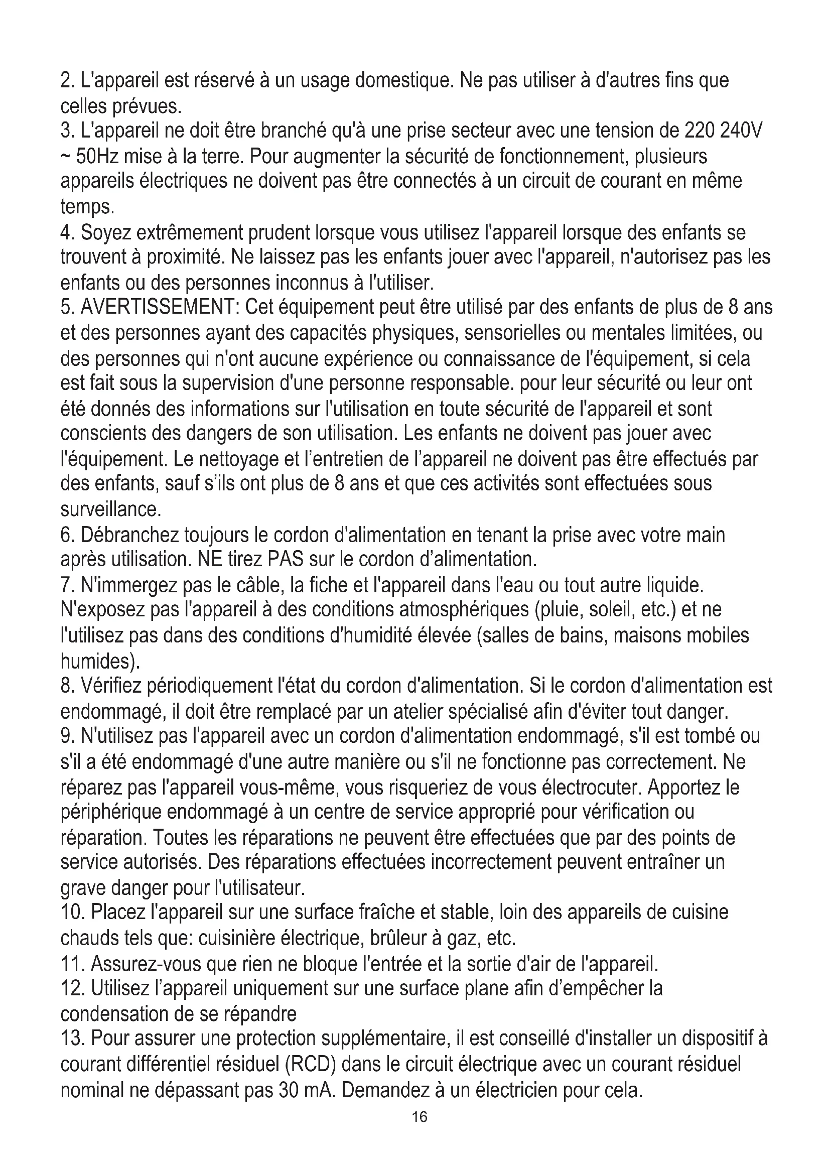 2. L'appareil est réservé à un usage domestique. Ne pas utiliser à d'autres fins que