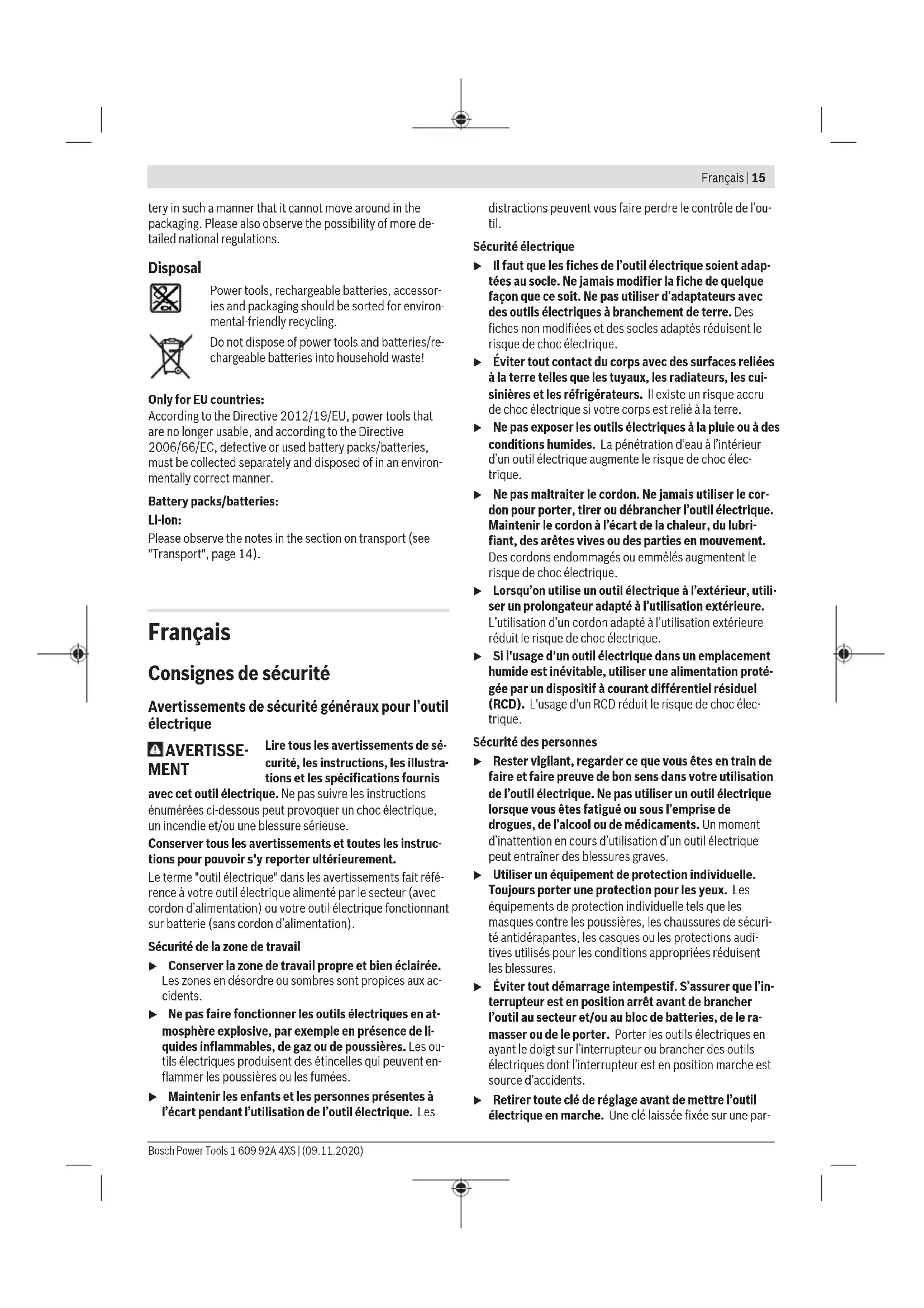The vibration level and noise emission value given in these instructions have been measured in accordance with a standardised measuring procedure and may be used to com- pare power tools. They may also be used for a preliminary estimation of vibration and noise emissions. The stated vibration level and noise emission value repres- ent the main applications of the power tool. However, if the power tool is used for other applications, with different ap- plication tools or is poorly maintained, the vibration level and noise emission value may differ. This may significantly increase the vibration and noise emissions over the total working period. To estimate vibration and noise emissions accurately, the times when the tool is switched off or when it is running but not actually being used should also be taken into account. This may significantly reduce vibration and noise emissions over the total working period. Implement additional safety measures to protect the oper- ator from the effects of vibration, such as servicing the power tool and application tools, keeping their hands warm, and organising workflows correctly. Assembly u Remove the battery from the power tool before carry- ing out work on the power tool (e.g. maintenance, changing tool, etc.). The battery should also be re- moved for transport and storage. There is risk of injury from unintentionally pressing the on/off switch. Charging the Battery u Use only the chargers listed in the technical data. Only these chargers are matched to the lithium-ion battery of your power tool. Note: The battery is supplied partially charged. To ensure full battery capacity, fully charge the battery in the charger before using your power tool for the first time. The lithium-ion battery can be charged at any time without reducing its service life. Interrupting the charging process does not damage the battery. The lithium-ion battery is protected against deep discharge by the "Electronic Cell Protection (ECP)". When the battery is discharged, the power tool is switched off by means of a protective circuit: The application tool no longer rotates. u Do not continue to press the On/Off switch after the power tool has automatically switched off. The battery can be damaged. Removing the battery To remove the battery(6), press the battery release button(5) and pull the battery to the rear and out of the power tool. Do not use force to do this. Changing the tool (see figure A) The drill spindle is locked when the on/off switch (8) is not pressed. This makes it possible to change the application tool in the drill chuck quickly, conveniently and easily. Open the keyless chuck (2) by turning it in the direction of rotation ➊ until the tool can be inserted. Insert the tool. Firmly tighten the sleeve of the keyless chuck (2) by turning it by hand in the rotational direction ➋ until it stops clicking. This will automatically lock the drill chuck. Dust/Chip Extraction Dust from materials such as lead-containing coatings, some wood types, minerals and metal can be harmful to one’s health. Touching or breathing-in the dust can cause allergic reactions and/or lead to respiratory infections of the user or bystanders. Certain dust, such as oak or beech dust, is considered carci- nogenic, especially in connection with wood-treatment ad- ditives (chromate, wood preservative). Materials containing asbestos may only be worked by specialists. – Provide for good ventilation of the working place. – It is recommended to wear a P2 filter-class respirator. Observe the relevant regulations in your country for the ma- terials to be worked. u Avoid dust accumulation at the workplace. Dust can easily ignite. Bosch Power Tools 1 609 92A 4XS | (09.11.2020)14 | English Operation Starting Operation Inserting the battery Note: The use of batteries unsuitable for your power tool can lead to malfunctions or damage to the power tool. Set the rotational direction switch (7) to the middle position to avoid unintentionally switching it on. Insert the charged battery (6) into the handle until you feel it engage and it is flush with the handle. Setting the rotational direction (see figureB) The rotational direction switch (7) is used to change the ro- tational direction of the power tool. However, this is not pos- sible while the on/off switch (8) is being pressed. Right rotation: To drill and to drive in screws, press the ro- tational direction switch (7) through to the left stop. Left Rotation: To loosen and unscrew screws and nuts, press the rotational direction switch (7) through to the right stop. Switching on/off To start the power tool, press and hold the on/off switch (8). To switch off the power tool, release the on/off switch (8). Adjusting the Speed You can adjust the speed of the power tool when it is on by pressing in the on/off switch (8) to varying extents. A light pressure on the on/off switch (8) results in a low rota- tional speed. Increased pressure on the switch causes an in- crease in speed. Preselecting the torque The torque presetting ring (3) can be used to preselect the required torque in 20 stages and "MAX". Once the set torque has been reached, the application tool will be stopped. For drilling use the "MAX" setting. Mechanical Gear Selection u You can press the gear selector switch (4) with the power tool off or on. You should not do this at full load or maximum torque, however. Gear I: Low speed range; for working with a large drilling diameter or for screwdriving. Gear II: High speed range; for working with a small drilling diameter. Temperature-dependent overload protection In normal conditions of use, the power tool cannot be over- loaded. If the power tool is overloaded or the permitted bat- tery temperature is exceeded, the electronics of the power tool will switch off until the temperature returns to within the optimum operating temperature range. Practical advice u Only apply the power tool to the screw/nut when the tool is switched off. Rotating too