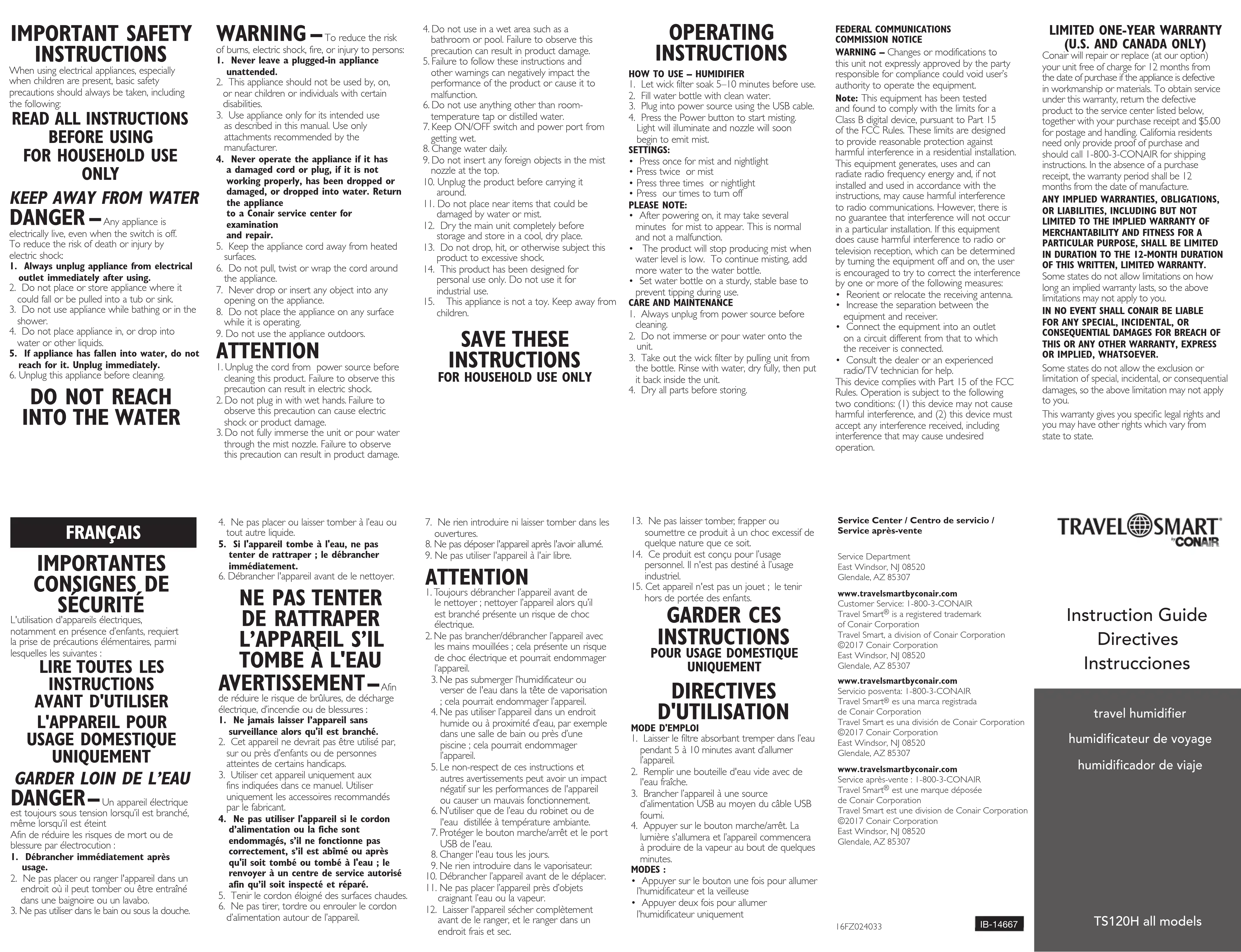 DIRECTIVES D'UTILISATION MODE D'EMPLOI1. Laisser le filtre absorbant tremper dans l’eaupendant 5 à 10 minutes avant d’allumerl’appareil.2. Remplir une bouteille d'eau vide avec del'eau fraîche.3. Brancher l’appareil à une sourced’alimentation USB au moyen du câble USBfourni.4. Appuyer sur le bouton marche/arrêt. Lalumière s'allumera et l’appareil commenceraà produire de la vapeur au bout de quelquesminutes.MODES:• Appuyer sur le bouton une fois pour allumerl’humidificateur et la veilleuse• Appuyer deux fois pour allumerl’humidificateur uniquementService Center / Centro de servicio / Service après-vente Service Department East Windsor, NJ 08520 Glendale, AZ 85307www.travelsmartbyconair.com Customer Service: 1-800-3-CONAIR Travel Smart is a registered trademark of Conair Corporation Travel Smart, a division of Conair Corporation ©2017 Conair Corporation East Windsor, NJ 08520 Glendale, AZ 85307www.travelsmartbyconair.com Servicio posventa: 1-800-3-CONAIR Travel Smart es una marca registrada de Conair Corporation Travel Smart es una división de Conair Corporation ©2017 Conair Corporation East Windsor, NJ 08520 Glendale, AZ 85307www.travelsmartbyconair.com Service après-vente : 1-800-3-CONAIR Travel Smart est une marque déposée de Conair Corporation Travel Smart est une division de Conair Corporation©2017 Conair Corporation East Windsor, NJ 08520 Glendale, AZ 85307 IB-1466716FZ024033• Appuyer deux fois pour allumer la veilleuse uniquement