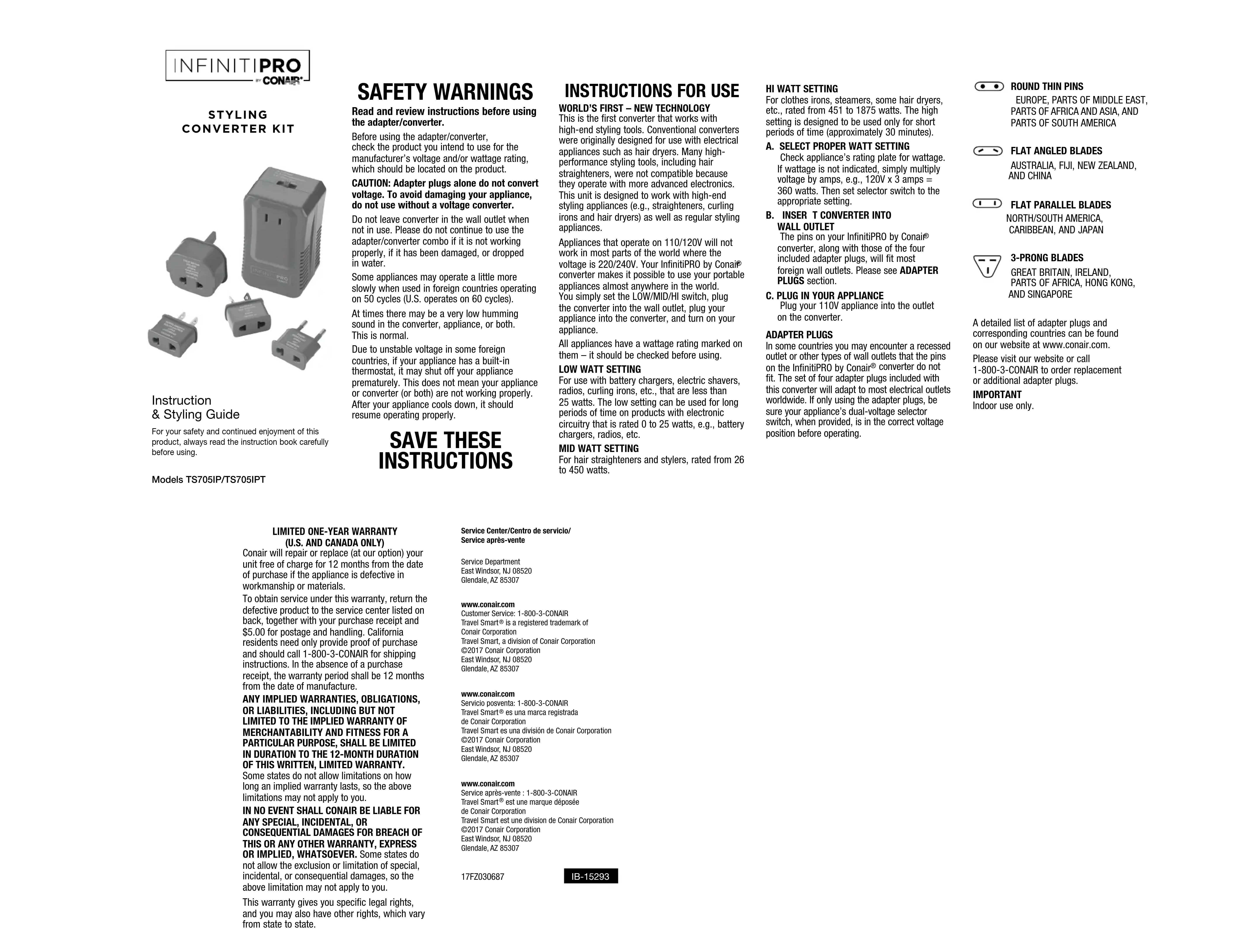 CE SOIT POUR BRIS DE CETTE GARANTIE OU DE TOUT AUTRE, EXPRESSE OU IMPLICITE. Certains États ne permettent pas l’exclusion ni la limitation des dommages particuliers, consécutifs ou indirects ; les limites précédentes peuvent donc ne pas s’appliquer dans votre cas. Cette garantie vous accorde des droits particuliers et vous pouvez également bénéficier d’autres droits qui varient d’un État à l’autre. Service Center/Centro de servicio/ Service après-vente Service Department East Windsor, NJ 08520 Glendale, AZ 85307www.conair.com Customer Service: 1-800-3-CONAIR Travel Smart is a registered trademark of Conair Corporation Travel Smart, a division of Conair Corporation ©2017 Conair Corporation East Windsor, NJ 08520 Glendale, AZ 85307www.conair.com Servicio posventa: 1-800-3-CONAIR Travel Smart es una marca registrada de Conair Corporation Travel Smart es una división de Conair Corporation ©2017 Conair Corporation East Windsor, NJ 08520 Glendale, AZ 85307www.conair.com Service après-vente : 1-800-3-CONAIR Travel Smart est une marque déposée de Conair Corporation Travel Smart est une division de Conair Corporation ©2017 Conair Corporation East Windsor, NJ 08520 Glendale, AZ 85307 17FZ030687 IB-15293