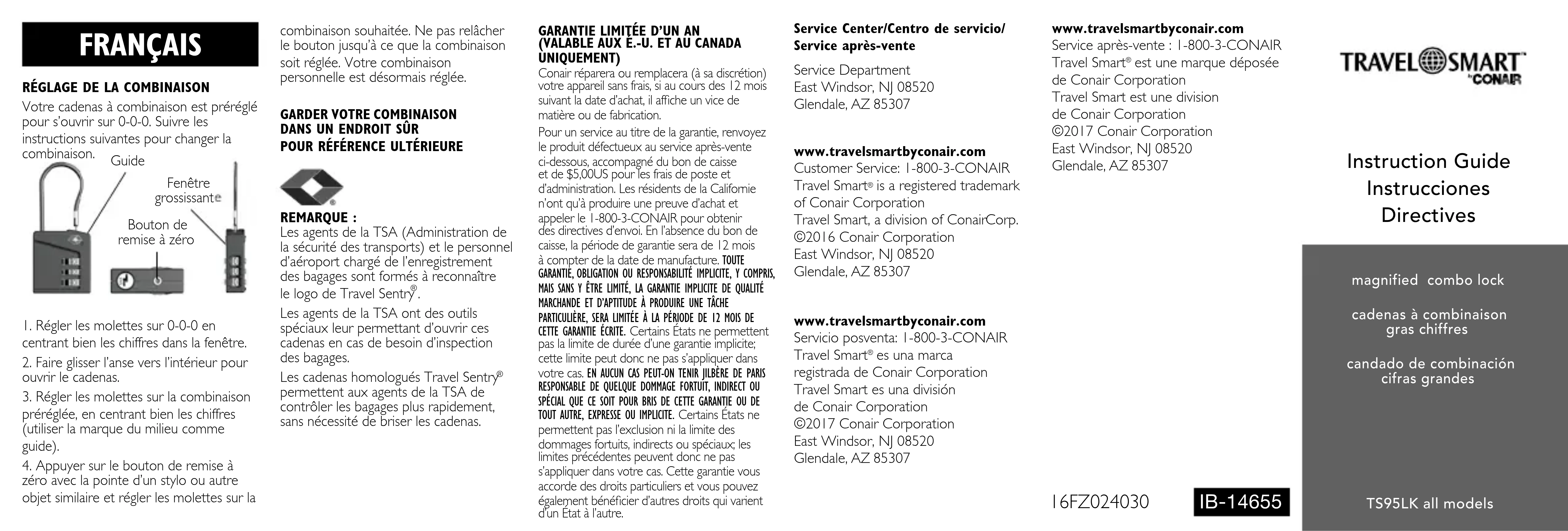 UNIQUEMENT) Conair réparera ou remplacera (à sa discrétion) votre appareil sans frais, si au cours des 12 mois suivant la date d’achat, il afche un vice de matière ou de fabrication. Pour un service au titre de la garantie, renvoyez le produit défectueux au service après-vente ci-dessous, accompagné du bon de caisse et de $5,00US pour les frais de poste et d’administration. Les résidents de la Californie n’ont qu’à produire une preuve d’achat et appeler le 1-800-3-CONAIR pour obtenir des directives d’envoi. En l’absence du bon de caisse, la période de garantie sera de 12 mois à compter de la date de manufacture. TOUTE GARANTIE, OBLIGATION OU RESPONSABILITÉ IMPLICITE, Y COMPRIS, MAIS SANS Y ÊTRE LIMITÉ, LA GARANTIE IMPLICITE DE QUALITÉ MARCHANDE ET D’APTITUDE À PRODUIRE UNE TÂCHE PARTICULIÈRE, SERA LIMITÉE À LA PÉRIODE DE 12 MOIS DE CETTE GARANTIE ÉCRITE. Certains États ne permettent pas la limite de durée d’une garantie implicite; cette limite peut donc ne pas s’appliquer dans votre cas. EN AUCUN CAS PEUT-ON TENIR JILBÈRE DE PARIS RESPONSABLE DE QUELQUE DOMMAGE FORTUIT, INDIRECT OU SPÉCIAL QUE CE SOIT POUR BRIS DE CETTE GARANTIE OU DE TOUT AUTRE, EXPRESSE OU IMPLICITE. Certains États ne permettent pas l’exclusion ni la limite des dommages fortuits, indirects ou spéciaux; les limites précédentes peuvent donc ne pas s’appliquer dans votre cas. Cette garantie vous accorde des droits particuliers et vous pouvez également bénécier d’autres droits qui varient d’un État à l’autre. Service Center/Centro de servicio/ Service après-vente Service Department East Windsor, NJ 08520 Glendale, AZ 85307 www.travelsmartbyconair.com Customer Service: 1-800-3-CONAIR Travel Smart