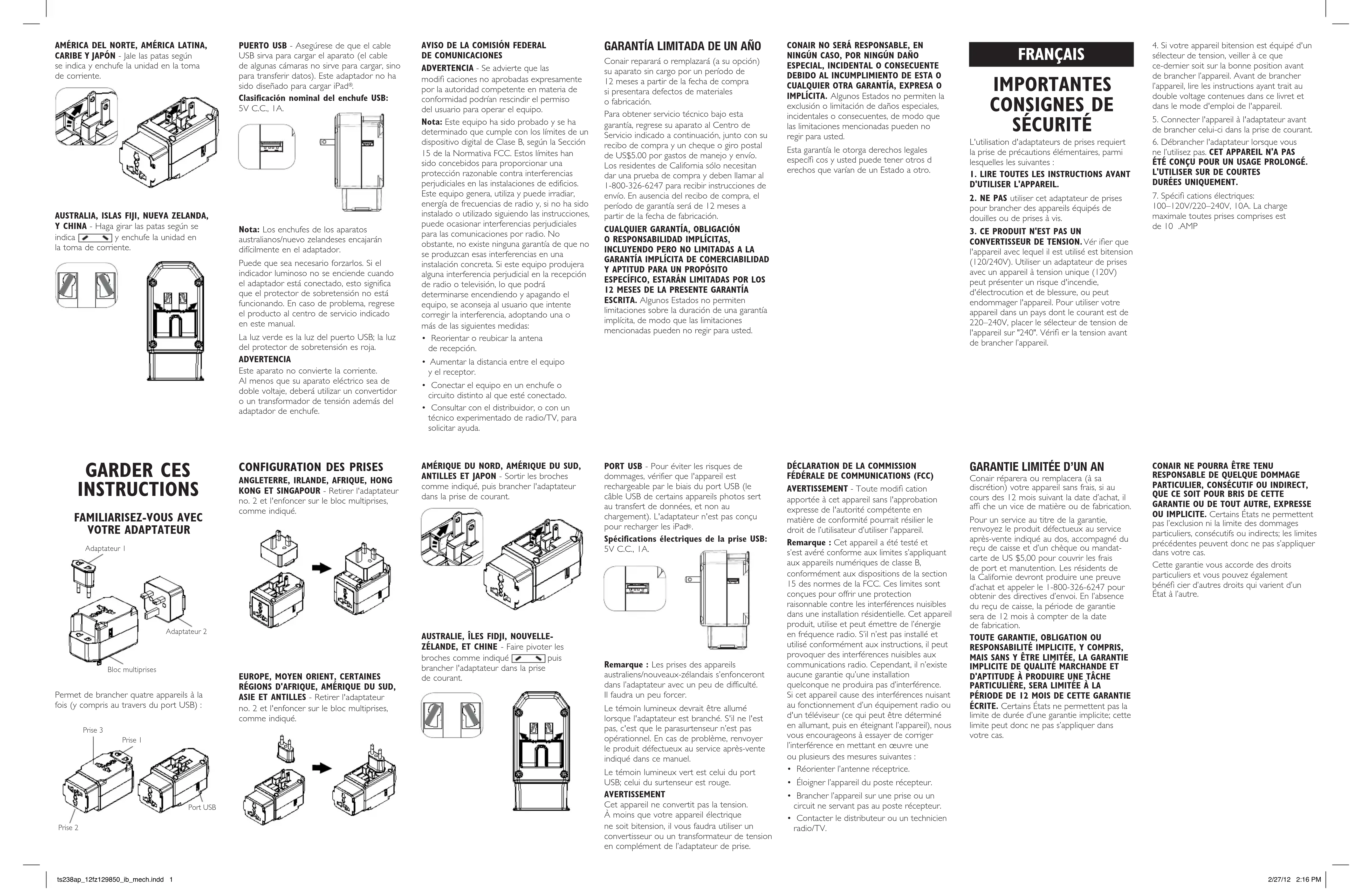 100–120V/220–240V, 10A. La charge maximale toutes prises comprises est de 10 .AMP GARDER CES INSTRUCTIONS FAMILIARISEZ-VOUS AVEC VOTRE ADAPTATEUR Adaptateur 1 Adaptateur 2 Bloc multiprises Permet de brancher quatre appareils à la fois (y compris au travers du port USB): Prise 2 Port USB Prise 3 Prise 1