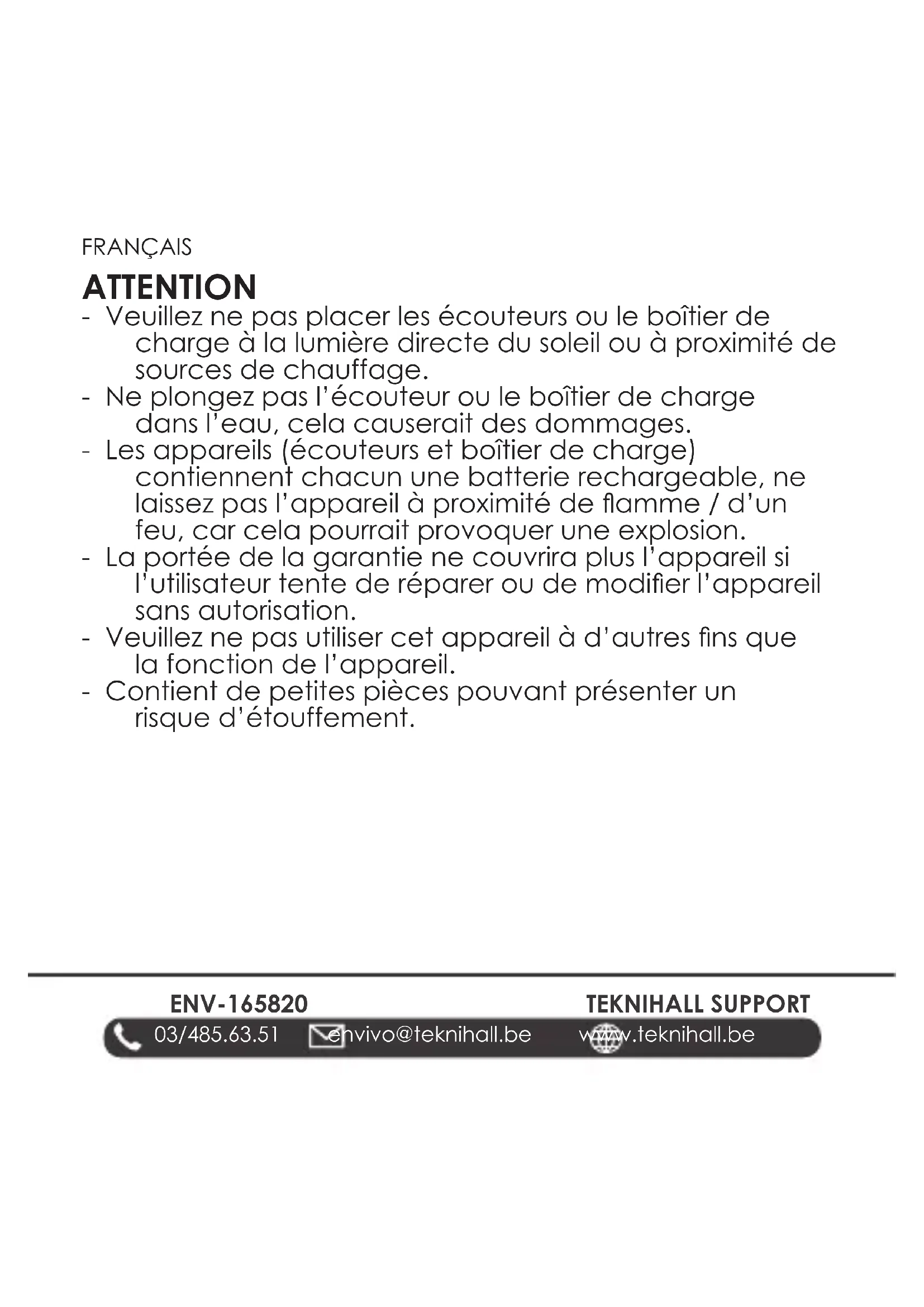 Naam, functie, handtekeningENV-165820 03/485.63.51 envivo@teknihall.be www.teknihall.be TEKNIHALL SUPPORT ATTENTION - Veuillez ne pas placer les écouteurs ou le boîtier de charge à la lumière directe du soleil ou à proximité de sources de chauffage. - Ne plongez pas l’écouteur ou le boîtier de charge dans l’eau, cela causerait des dommages. - Les appareils (écouteurs et boîtier de charge) contiennent chacun une batterie rechargeable, ne laissez pas l’appareil à proximité de flamme / d’un feu, car cela pourrait provoquer une explosion. - La portée de la garantie ne couvrira plus l’appareil si l’utilisateur tente de réparer ou de modier l’appareil sans autorisation. - Veuillez ne pas utiliser cet appareil à d’autres ns que la fonction de l’appareil. - Contient de petites pièces pouvant présenter un risque d’étouffement. FRANÇAISENV-1658 21 03/485.63.51 envivo@teknihall.be www.teknihall.be TEKNIHALL SUPPORT Ce produit contient un matériau magnétique. Consultez votre médecin pour savoir si cela pourrait affecter votre dispositif médical implantable.