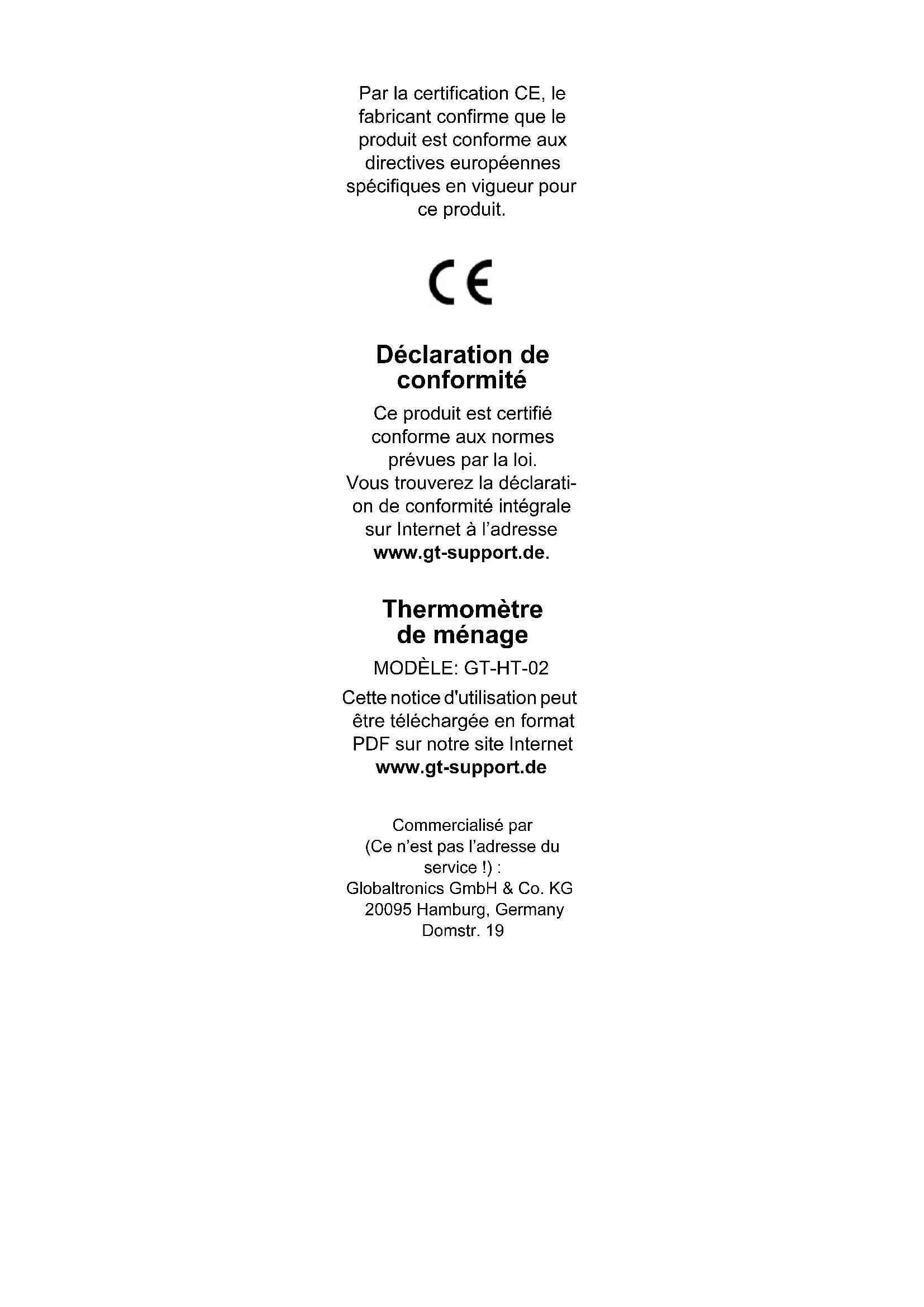 Druckbuch HH Thermometer BEL.book Seite 18 Mittwoch, 22. Juli 2015 9:41 09GT-HT-02 51/2015 B THERMOMÈTRE CULINAIRE Utilisation Druckbuch HH Thermometer BEL.book Seite 19 Mittwoch, 22. Juli 2015 9:41 09Par la certification CE, le fabricant confirme que le produit est conforme aux directives européennes spécifiques en vigueur pour ce produit. Déclaration de conformité Ce produit est certifié conforme aux normes prévues par la loi. Vous trouverez la déclarati- on de conformité intégrale sur Internet à l’adresse www.gt-support.de. Thermomètre de ménage