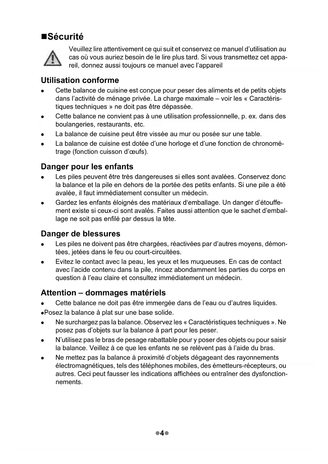 - Elimination Wandwaage FR E44269.book Seite 3 Donnerstag, 27. Oktober 2011 3:26 15 4 Sécurité Veuillez lire attentivement ce qui suit et conservez ce manuel d’utilisation au cas où vous auriez besoin de le lire plus tard. Si vous transmettez cet appa- reil, donnez aussi toujours ce manuel avec l’appareil Utilisation conforme Cette balance de cuisine est conçue pour peser des aliments et de petits objets dans l’activité de ménage privée. La charge maximale – voir les « Caractéris- tiques techniques » ne doit pas être dépassée. Cette balance ne convient pas à une utilisation professionnelle, p. ex. dans des boulangeries, restaurants, etc. La balance de cuisine peut être vissée au mur ou posée sur une table. La balance de cuisine est dotée d’une horloge et d’une fonction de chronomé- trage (fonction cuisson d’œufs). Danger pour les enfants Les piles peuvent être très dangereuses si elles sont avalées. Conservez donc la balance et la pile en dehors de la portée des petits enfants. Si une pile a été avalée, il faut immédiatement consulter un médecin. Gardez les enfants éloignés des matériaux d‘emballage. Un danger d’étouffe- ment existe si ceux-ci sont avalés. Faites aussi attention que le sachet d’embal- lage ne soit pas enfilé par dessus la tête. Danger de blessures Les piles ne doivent pas être chargées, réactivées par d’autres moyens, démon- tées, jetées dans le feu ou court-circuitées. Evitez le contact avec la peau, les yeux et les muqueuses. En cas de contact avec l’acide contenu dans la pile, rincez abondamment les parties du corps en question à l’eau claire et consultez immédiatement un médecin. Attention – dommages matériels Cette balance ne doit pas être immergée dans de l’eau ou d’autres liquides. Posez la balance à plat sur une base solide. Ne surchargez pas la balance. Observez les « Caractéristiques techniques ». Ne posez pas d’objets sur la balance à part pour les peser. N’utilisez pas le bras de pesage rabattable pour y poser des objets ou pour saisir la balance. Veillez à ce que les enfants ne se relèvent pas à l’aide du bras. Ne mettez pas la balance à proximité d’objets dégageant des rayonnements électromagnétiques, tels des téléphones mobiles, des émetteurs-récepteurs, ou autres. Ceci peut fausser les indications affichées ou entraîner des dysfonction- nements. Wandwaage FR E44269.book Seite 4 Donnerstag, 27. Oktober 2011 3:26 15 5 p. 14