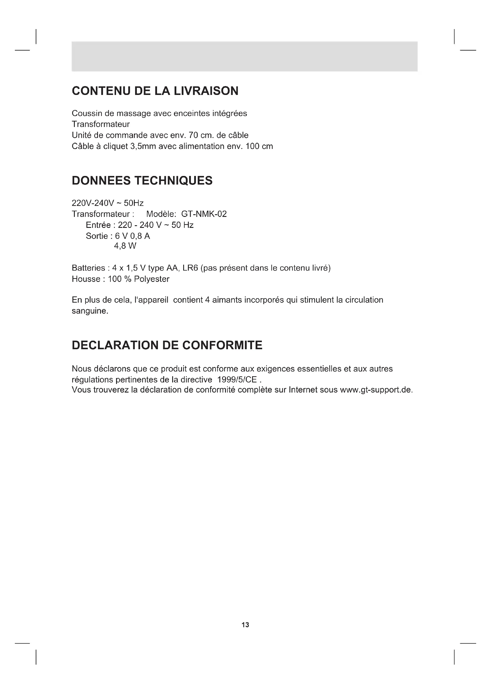 Coussin de massage avec enceintes intégrées Transformateur Unité de commande avec env. 70 cm. de câble Câble à cliquet 3,5mm avec alimentation env. 100 cm DONNEES TECHNIQUES 220V-240V ~ 50Hz Transformateur : Modèle: GT-NMK-02 Entrée : 220 - 240 V ~ 50 Hz Sortie : 6 V 0,8 A 4,8 W Batteries : 4 x 1,5 V type AA, LR6 (pas présent dans le contenu livré) Housse : 100 % Polyester En plus de cela, l‘appareil contient 4 aimants incorporés qui stimulent la circulation sanguine.