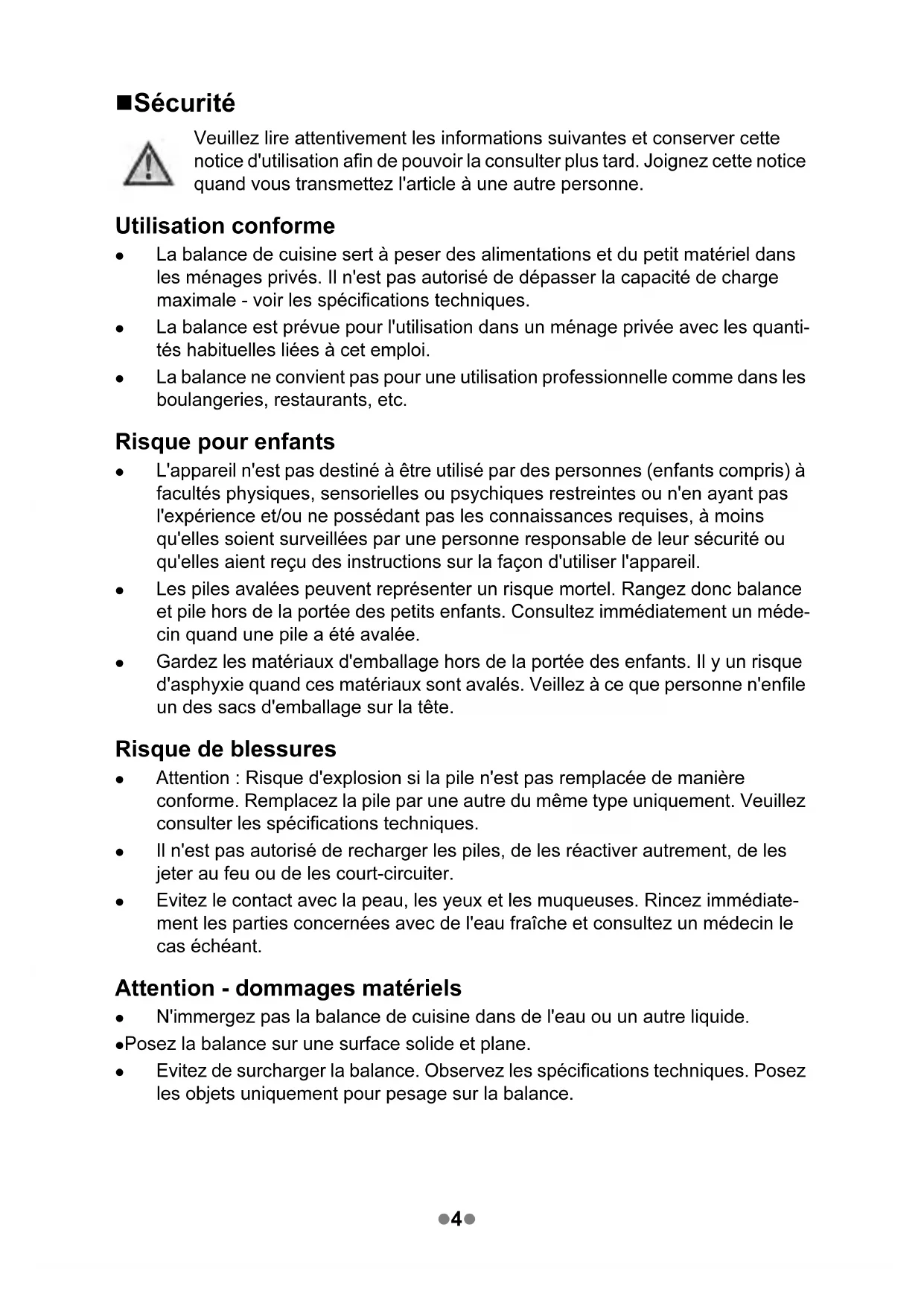 - Elimination Wandwaage FR_IVZ.fm Seite 3 Donnerstag, 27. Oktober 2011 3:04 15 4 Sécurité Veuillez lire attentivement les informations suivantes et conserver cette notice d'utilisation afin de pouvoir la consulter plus tard. Joignez cette notice quand vous transmettez l'article à une autre personne. Utilisation conforme La balance de cuisine sert à peser des alimentations et du petit matériel dans les ménages privés. Il n'est pas autorisé de dépasser la capacité de charge maximale - voir les spécifications techniques. La balance est prévue pour l'utilisation dans un ménage privée avec les quanti- tés habituelles liées à cet emploi. La balance ne convient pas pour une utilisation professionnelle comme dans les boulangeries, restaurants, etc. Risque pour enfants L'appareil n'est pas destiné à être utilisé par des personnes (enfants compris) à facultés physiques, sensorielles ou psychiques restreintes ou n'en ayant pas l'expérience et/ou ne possédant pas les connaissances requises, à moins qu'elles soient surveillées par une personne responsable de leur sécurité ou qu'elles aient reçu des instructions sur la façon d'utiliser l'appareil. Les piles avalées peuvent représenter un risque mortel. Rangez donc balance et pile hors de la portée des petits enfants. Consultez immédiatement un méde- cin quand une pile a été avalée. Gardez les matériaux d'emballage hors de la portée des enfants. Il y un risque d'asphyxie quand ces matériaux sont avalés. Veillez à ce que personne n'enfile un des sacs d'emballage sur la tête. Risque de blessures Attention : Risque d'explosion si la pile n'est pas remplacée de manière conforme. Remplacez la pile par une autre du même type uniquement. Veuillez consulter les spécifications techniques. Il n'est pas autorisé de recharger les piles, de les réactiver autrement, de les jeter au feu ou de les court-circuiter. Evitez le contact avec la peau, les yeux et les muqueuses. Rincez immédiate- ment les parties concernées avec de l'eau fraîche et consultez un médecin le cas échéant. Attention - dommages matériels N'immergez pas la balance de cuisine dans de l'eau ou un autre liquide. Posez la balance sur une surface solide et plane. Evitez de surcharger la balance. Observez les spécifications techniques. Posez les objets uniquement pour pesage sur la balance. Kuechenwaage FR E44269.book Seite 4 Donnerstag, 27. Oktober 2011 2:59 14 5 p. 11
