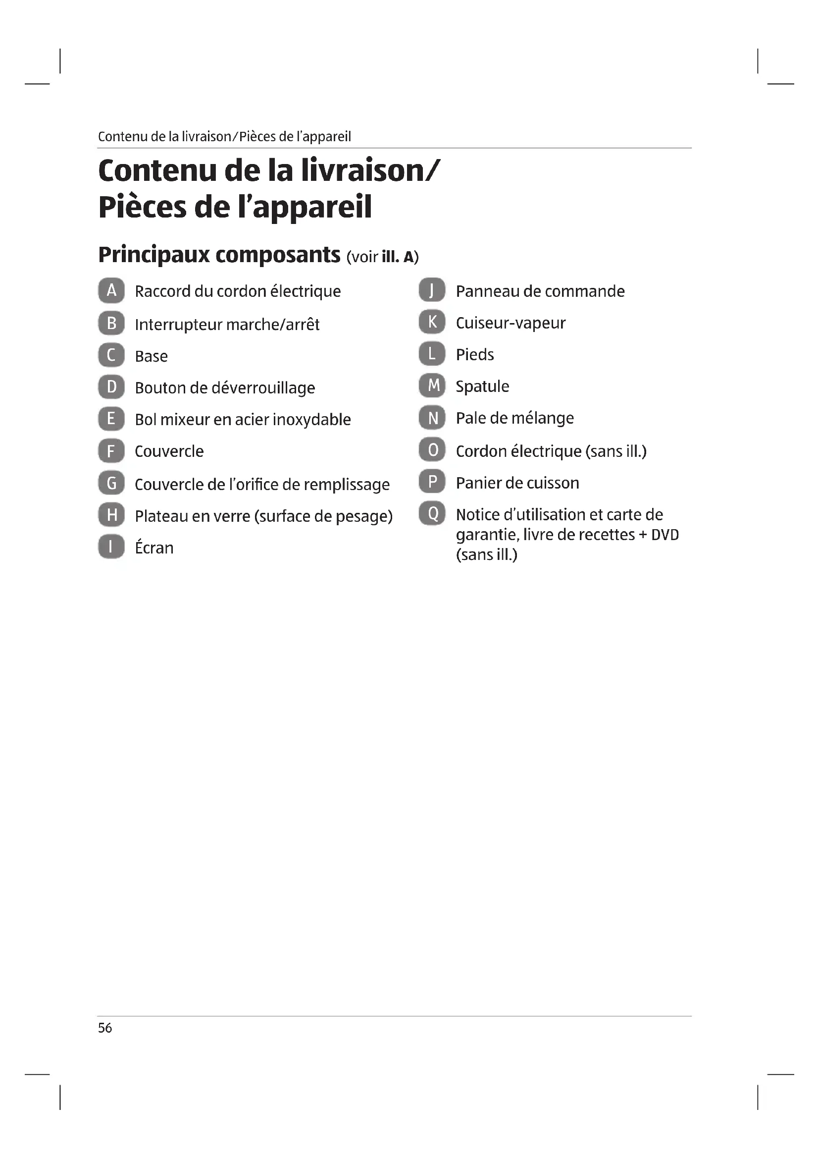 - Contenu de la livraison⁄ Pièces de l’appareil p. 56
