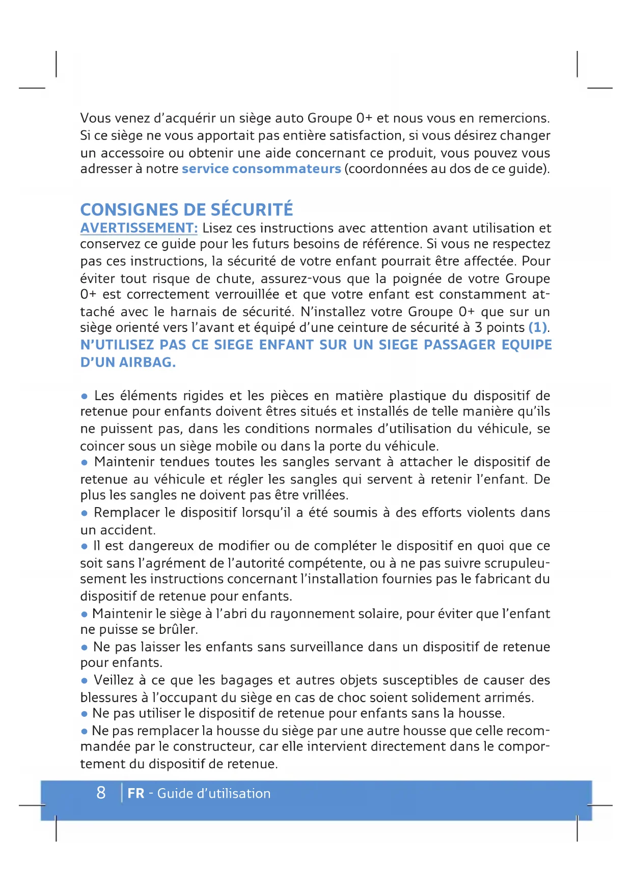 FR - Guide d’utilisation Vous venez d’acquérir un siège auto Groupe 0+ et nous vous en remercions. Si ce siège ne vous apportait pas entière satisfaction, si vous désirez changer un accessoire ou obtenir une aide concernant ce produit, vous pouvez vous adresser à notre service consommateurs (coordonnées au dos de ce guide).