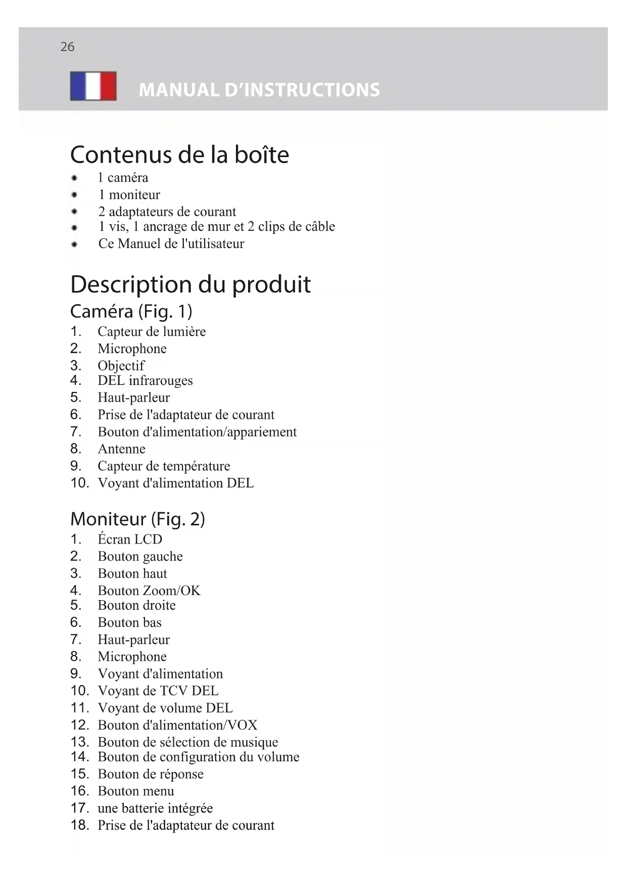 Installation Alimentation - Avec alimentation secteur1. Branchez un coté de l’adaptateur d'alimentation fourni sur une prise de courant et l’autre coté sur la prise à l'arrière de la caméra. Voir Fig. 3.2. Appuyez sur le bouton ALIMENTATION et maintenez-le 1 seconde pour allumer la caméra. Le DEL de la caméra s'allumera (couleur verte). Voir Fig. 3. Remarque : Appuyez sur le bouton ALIMENTATION et maintenez-le 1 seconde pour éteindre la caméra.Réglages précisPlacez la caméra à un endroit pratique, pointez l'objectif vers la zone d'observation.Vision nocturneLa caméra possède huit DEL haute intensité pour prendre des images claires dans l'obscurité. Quand le détecteur de lumière détecte des niveaux de lumière ambiante faibles, les DEL seront activées automatiquement.Mesure de la température de la pièceLe capteur de température peut mesurer la température de la pièce où la caméra a été installée et l'indicateur de température de pièce sera affiché sur l'écran de l'unité du moniteur.Installation de la caméra