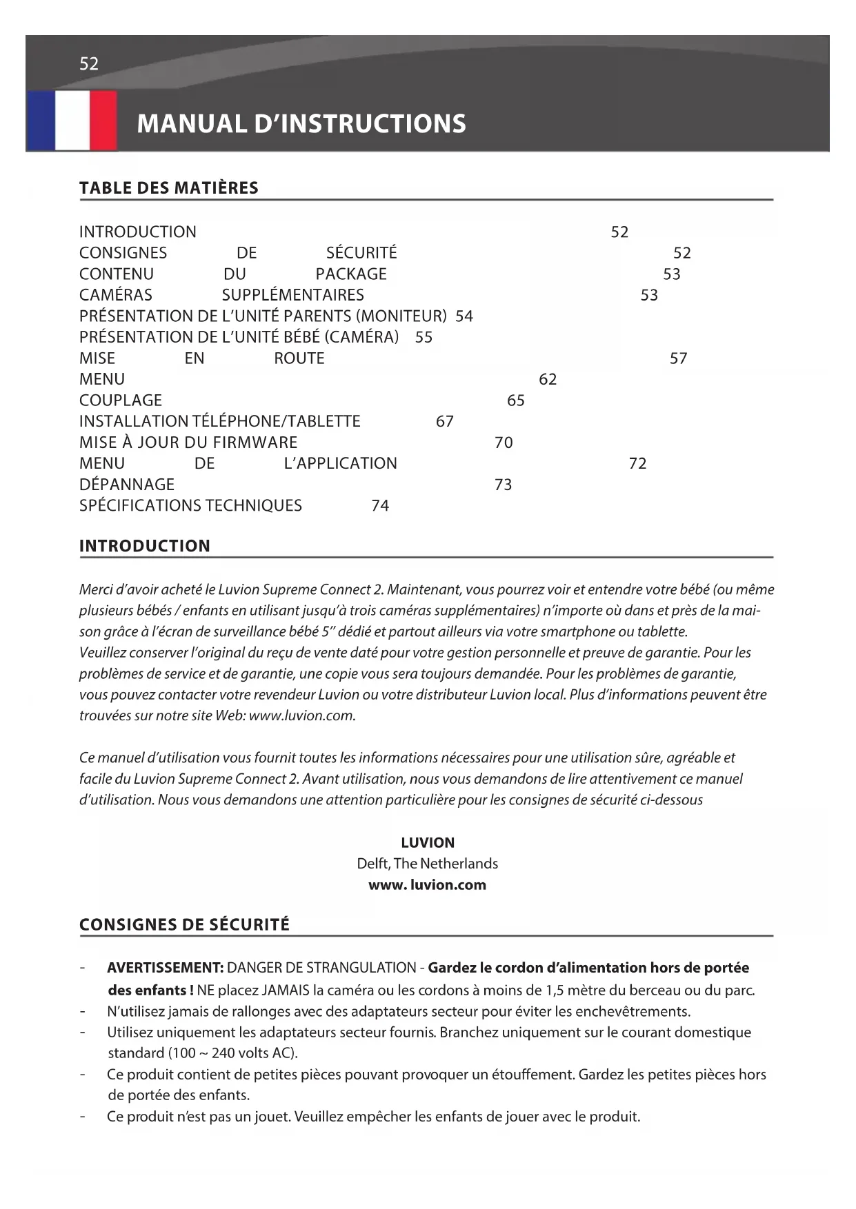 INTRODUCTION Merci d’avoir acheté le Luvion Supreme Connect 2. Maintenant, vous pourrez voir et entendre votre bébé (ou même plusieurs bébés / enfants en utilisant jusqu’à trois caméras supplémentaires) n’importe où dans et près de la mai- son grâce à l’écran de surveillance bébé 5’’ dédié et partout ailleurs via votre smartphone ou tablette. Veuillez conserver l’original du reçu de vente daté pour votre gestion personnelle et preuve de garantie. Pour les problèmes de service et de garantie, une copie vous sera toujours demandée. Pour les problèmes de garantie, vous pouvez contacter votre revendeur Luvion ou votre distributeur Luvion local. Plus d’informations peuvent être trouvées sur notre site Web: www.luvion.com. Ce manuel d’utilisation vous fournit toutes les informations nécessaires pour une utilisation sûre, agréable et facile du Luvion Supreme Connect 2. Avant utilisation, nous vous demandons de lire attentivement ce manuel d’utilisation. Nous vous demandons une attention particulière pour les consignes de sécurité ci-dessous LUVION Delft, The Netherlands www. luvion.com
