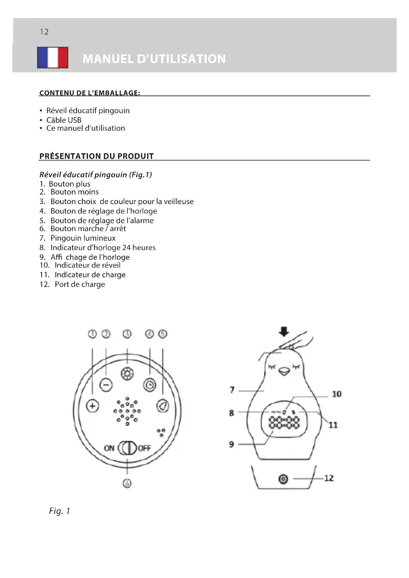 INTRODUCTIONMerci d’avoir acheté le réveil éducatif pingouin. Assurez-vous de toujours conserver votre preuve d’achat originale. Pour les cas de garantie, il vous sera toujours demandé de montrer une copie de votre preuve d’achat. Pour les demandes de garantie, vous pouvez contacter le revendeur Lu-vion ou le représentant Luvion local. Pour plus d’informations rendez-vous sur www.luvion.com. Ce manuel contient toutes les informations dont vous avez besoin pour pouvoir utiliser le réveil éducatif pingouin en toute sécurité et avec plaisir. Avant d’utiliser le réveil éducatif pingouin, nous vous recommandons de lire attentivement ce manuel. Nous demandons votre attention particulière pour les consignes de sécurité.INSTRUCTIONS IMPORTANTES DE PRÉCAUTION DE SÉCURITÉ ET DE MAINTENANCEVeuillez noter les précautions suivantes avant utilisation. Le non-respect de cette consigne peut être dangereux.• Veuillez charger le produit au moins 30 minutes avant l’utilisation;• Veuillez garder le produit à l’écart d’environnements à haute température et humidité élevée;• Ne nettoyez pas le support avec des liquides acides ou alcalins;• N’essayez pas de démonter, réparer ou modi er ce produit sans autorisation;• La tension de fonctionnement de ce produit est de 5V, veuillez utiliser le câble USB inclus;• Veuillez utiliser un chi on doux et sec pour essuyer la poussière du matériau en silicone,• Remarque: éteignez le produit avant de faire cela;• N’immergez pas le produit ni le câble USB dans l’eauPREMIÈRE CONFIGURATION• Connectez le produit à un port USB ou avec un adaptateur secteur. Utilisez le câble USB inclus pour charger le pingouin. Remarque: aucun adaptateur 220V n’est inclus.• Veuillez vous assurer de charger le pingouin avant de l’utiliser. Il est recommandé de le charger au moins 30 minutes avant utilisation.• Ce pingouin est un réveil éducatif qui signale à votre enfant quand il peut se lever.Vous pouvez également l’utiliser comme veilleuse dans la chambre de bébé.COMMENT UTILISER ALLUMER / ÉTEINDRE LE PINGOUIN• Allumez / éteignez le pingouin en faisant glisser le bouton vers la droite / gauche (6).VEILLEUSE• Lorsque le produit a été activé (mode ON), appuyez une fois sur le dessus (du pingouin) pour activer la veilleuse.