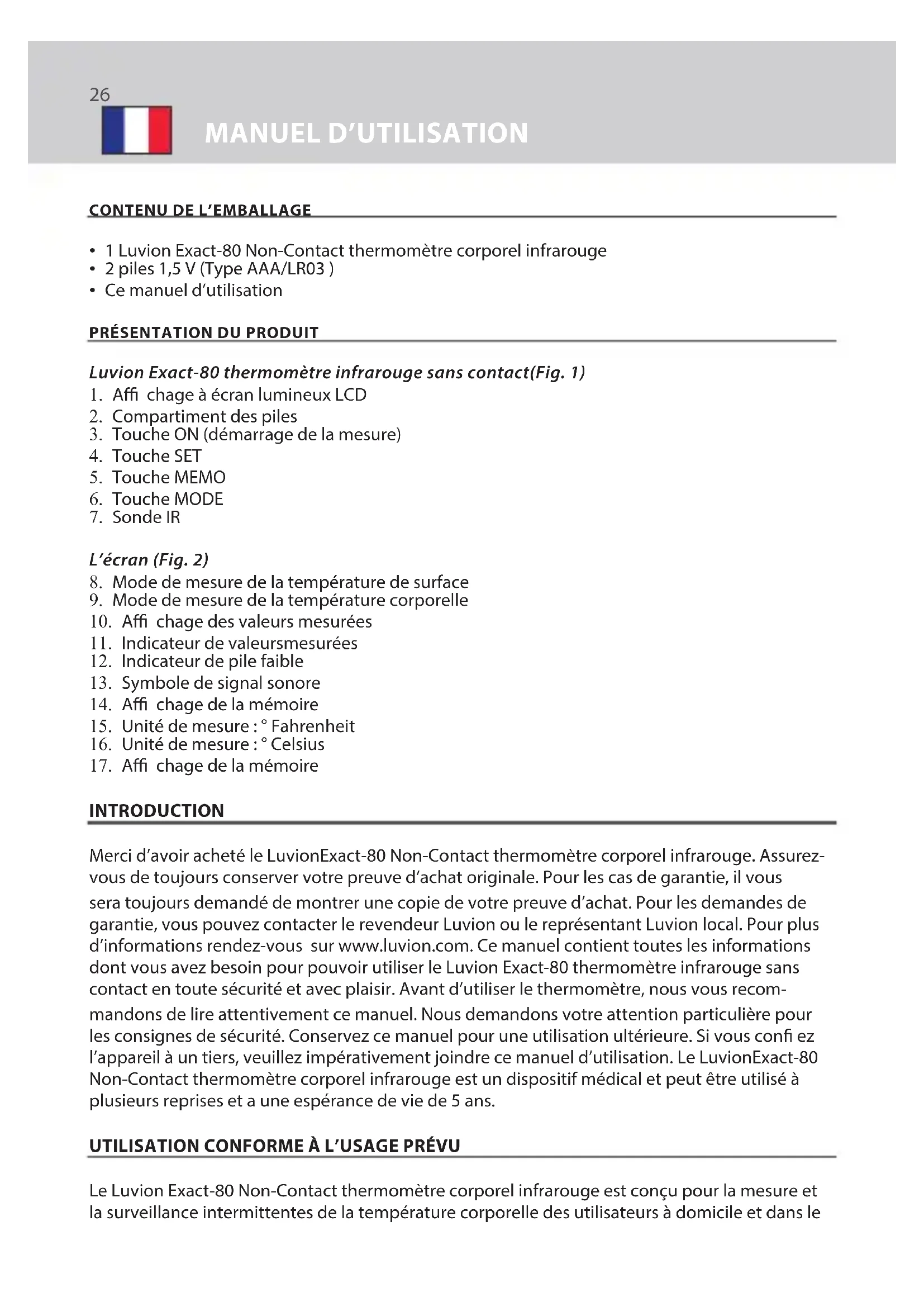 INTRODUCTION Merci d’avoir acheté le LuvionExact-80 Non-Contact thermomètre corporel infrarouge. Assurez- vous de toujours conserver votre preuve d’achat originale. Pour les cas de garantie, il vous sera toujours demandé de montrer une copie de votre preuve d’achat. Pour les demandes de garantie, vous pouvez contacter le revendeur Luvion ou le représentant Luvion local. Pour plus d’informations rendez-vous sur www.luvion.com. Ce manuel contient toutes les informations dont vous avez besoin pour pouvoir utiliser le Luvion Exact-80 thermomètre infrarouge sans contact en toute sécurité et avec plaisir. Avant d’utiliser le thermomètre, nous vous recom- mandons de lire attentivement ce manuel. Nous demandons votre attention particulière pour les consignes de sécurité. Conservez ce manuel pour une utilisation ultérieure. Si vous con ez l’appareil à un tiers, veuillez impérativement joindre ce manuel d’utilisation. Le LuvionExact-80 Non-Contact thermomètre corporel infrarouge est un dispositif médical et peut être utilisé à plusieurs reprises et a une espérance de vie de 5 ans.