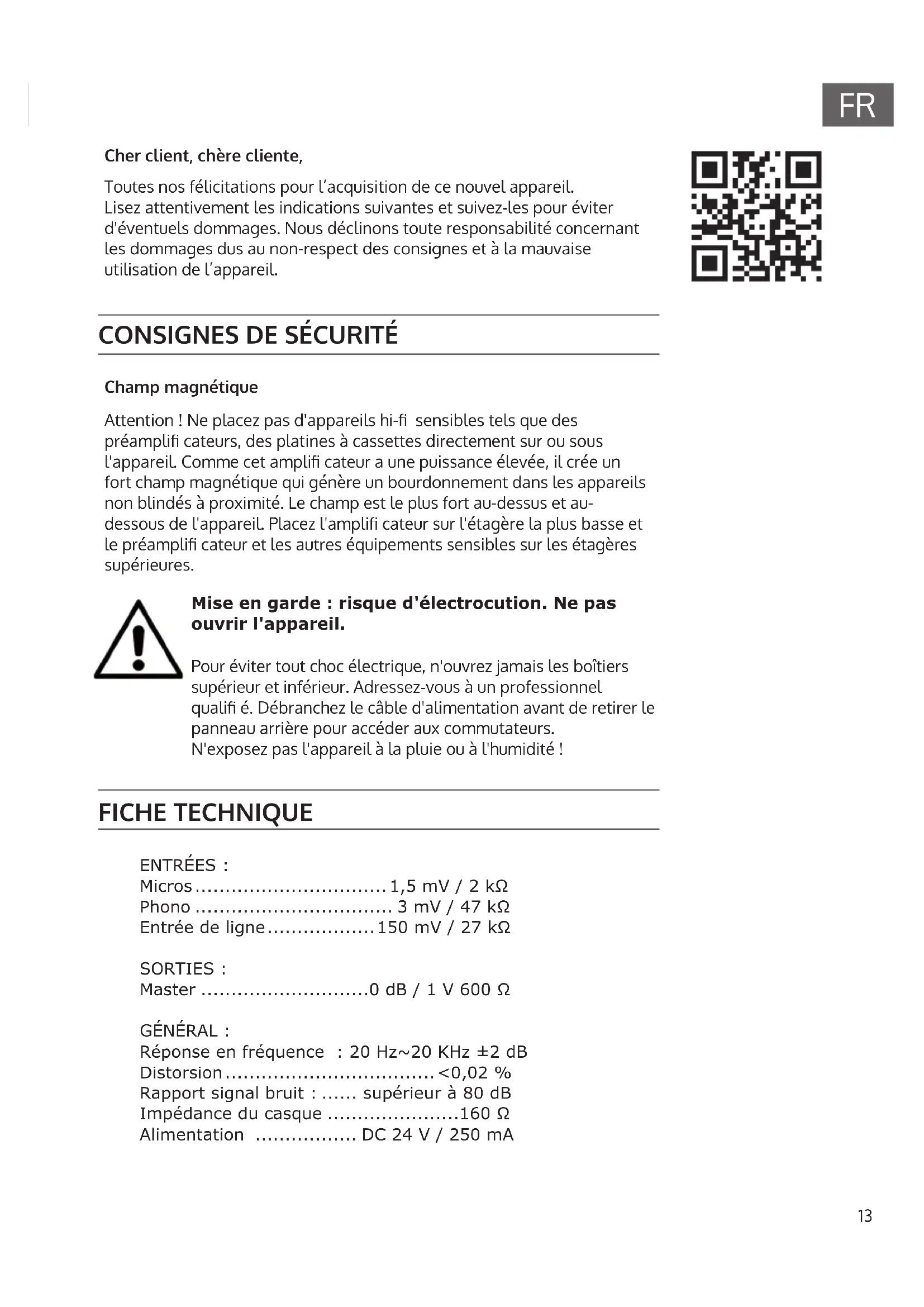 Champ magnétique Attention ! Ne placez pas d'appareils hi- sensibles tels que des préampli cateurs, des platines à cassettes directement sur ou sous l'appareil. Comme cet ampli cateur a une puissance élevée, il crée un fort champ magnétique qui génère un bourdonnement dans les appareils non blindés à proximité. Le champ est le plus fort au-dessus et au- dessous de l'appareil. Placez l'ampli cateur sur l'étagère la plus basse et le préampli cateur et les autres équipements sensibles sur les étagères supérieures. Mise en garde : risque d'électrocution. Ne pas ouvrir l'appareil. Pour éviter tout choc électrique, n'ouvrez jamais les boîtiers supérieur et inférieur. Adressez-vous à un professionnel quali é. Débranchez le câble d'alimentation avant de retirer le panneau arrière pour accéder aux commutateurs. N'exposez pas l'appareil à la pluie ou à l'humidité ! FICHE TECHNIQUE ENTRÉES : Micros ................................ 1,5 mV / 2 kΩ Phono ................................. 3 mV / 47 kΩ Entrée de ligne .................. 150 mV / 27 kΩ SORTIES : Master ............................0 dB / 1 V 600 Ω GÉNÉRAL : Réponse en fréquence : 20 Hz~20 KHz ±2 dB Distorsion ................................... <0,02 % Rapport signal bruit : ...... supérieur à 80 dB Impédance du casque ......................160 Ω Alimentation ................. DC 24 V / 250 mA14
