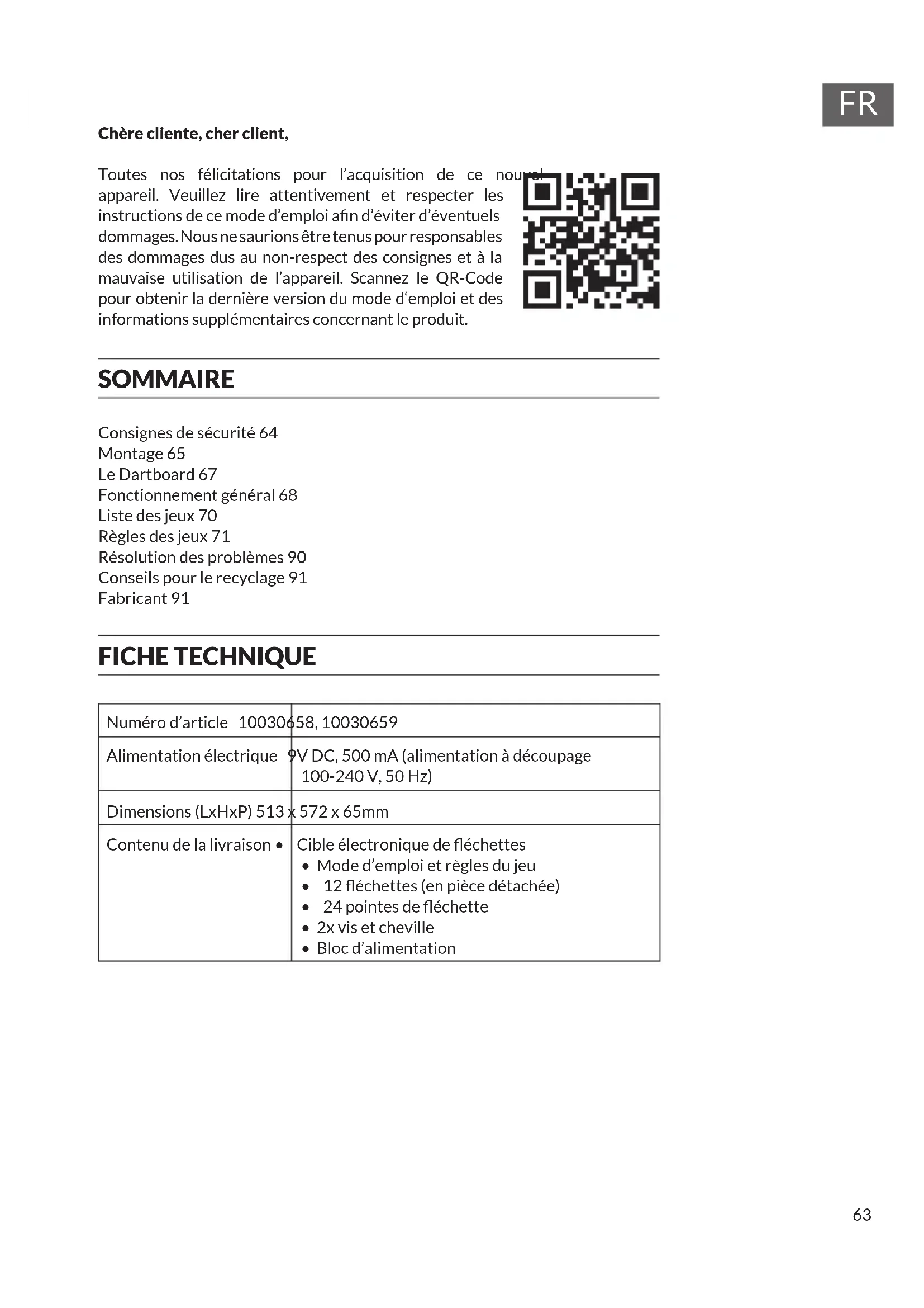 Chère cliente, cher client, Toutes nos félicitations pour l’acquisition de ce nouvel appareil. Veuillez lire attentivement et respecter les instructionsdecemoded’emploiand’éviterd’éventuels dommages. Nous ne saurions être tenus pour responsables des dommages dus au non-respect des consignes et à la mauvaise utilisation de l’appareil. Scannez le QR-Code pour obtenir la dernière version du mode d‘emploi et des informationssupplémentairesconcernantleproduit. SOMMAIRE Consignesdesécurité64 Montage 65 Le Dartboard 67 Fonctionnementgénéral68 Liste des jeux 70 Règles des jeux 71 Résolutiondesproblèmes90 Conseilspourlerecyclage91 Fabricant 91 FICHE TECHNIQUE Numérod’article 10030658, 10030659 Alimentationélectrique 9VDC,500mA(alimentationàdécoupage 100-240 V, 50 Hz) Dimensions (LxHxP) 513 x 572 x 65mm Contenu de la livraison • Cibleélectroniquedeéchettes