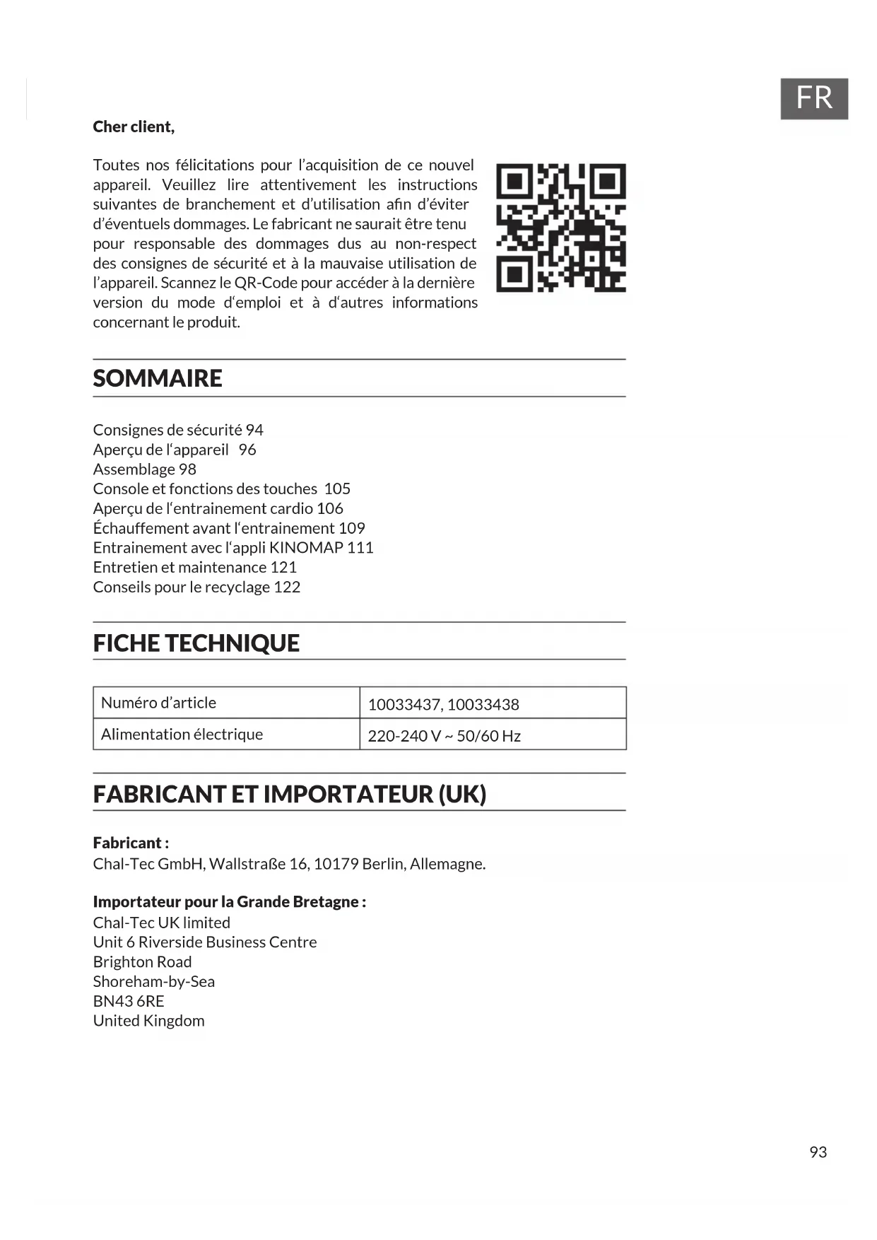 Cher client, Toutes nos félicitations pour l’acquisition de ce nouvel appareil. Veuillez lire attentivement les instructions suivantes de branchement et d’utilisation an d’éviter d’éventuels dommages. Le fabricant ne saurait être tenu pour responsable des dommages dus au non-respect des consignes de sécurité et à la mauvaise utilisation de l’appareil. Scannez le QR-Code pour accéder à la dernière version du mode d‘emploi et à d‘autres informations concernant le produit. SOMMAIRE Consignes de sécurité 94 Aperçu de l‘appareil 96 Assemblage 98 Console et fonctions des touches 105 Aperçu de l‘entrainement cardio 106 Échauffement avant l‘entrainement 109 Entrainement avec l‘appli KINOMAP 111 Entretien et maintenance 121 Conseils pour le recyclage 122 FICHE TECHNIQUE Numéro d’article 10033437, 10033438 Alimentation électrique 220-240 V ~ 50/60 Hz FABRICANT ET IMPORTATEUR (UK) Fabricant : Chal-Tec GmbH, Wallstraße 16, 10179 Berlin, Allemagne. Importateur pour la Grande Bretagne : Chal-Tec UK limited Unit 6 Riverside Business Centre Brighton Road Shoreham-by-Sea BN43 6RE United Kingdom94