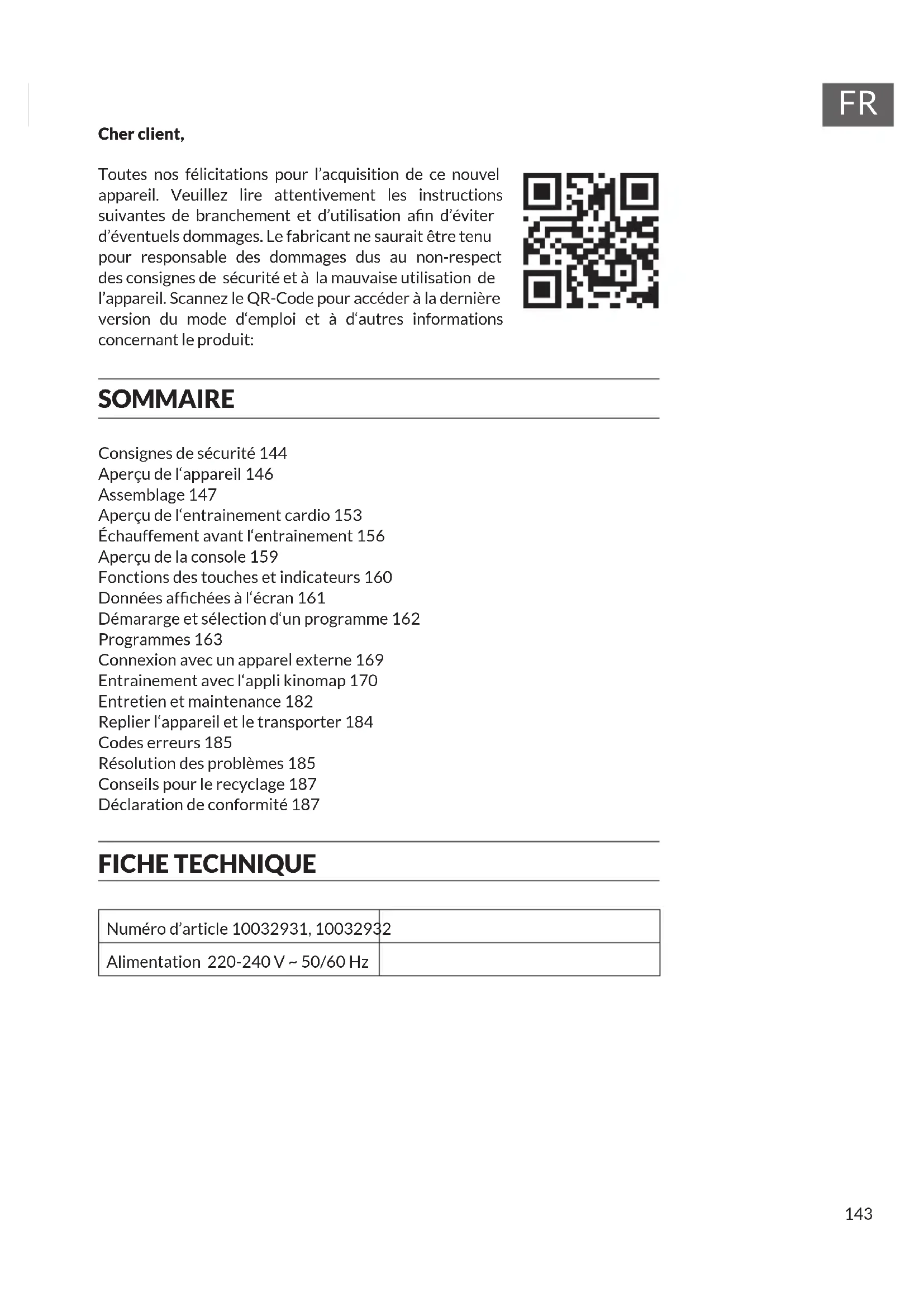 Cher client, Toutes nos félicitations pour l’acquisition de ce nouvel appareil. Veuillez lire attentivement les instructions suivantes de branchement et d’utilisation an d’éviter d’éventuels dommages. Le fabricant ne saurait être tenu pour responsable des dommages dus au non-respect des consignes de sécurité et à la mauvaise utilisation de l’appareil. Scannez le QR-Code pour accéder à la dernière version du mode d‘emploi et à d‘autres informations concernant le produit: SOMMAIRE Consignes de sécurité 144 Aperçu de l‘appareil 146 Assemblage 147 Aperçu de l‘entrainement cardio 153 Échauffement avant l‘entrainement 156 Aperçu de la console 159 Fonctions des touches et indicateurs 160 Données afchées à l‘écran 161 Démararge et sélection d‘un programme 162 Programmes 163 Connexion avec un apparel externe 169 Entrainement avec l‘appli kinomap 170 Entretien et maintenance 182 Replier l‘appareil et le transporter 184 Codes erreurs 185 Résolution des problèmes 185 Conseils pour le recyclage 187 Déclaration de conformité 187 FICHE TECHNIQUE Numéro d’article 10032931, 10032932 Alimentation 220-240 V ~ 50/60 Hz144