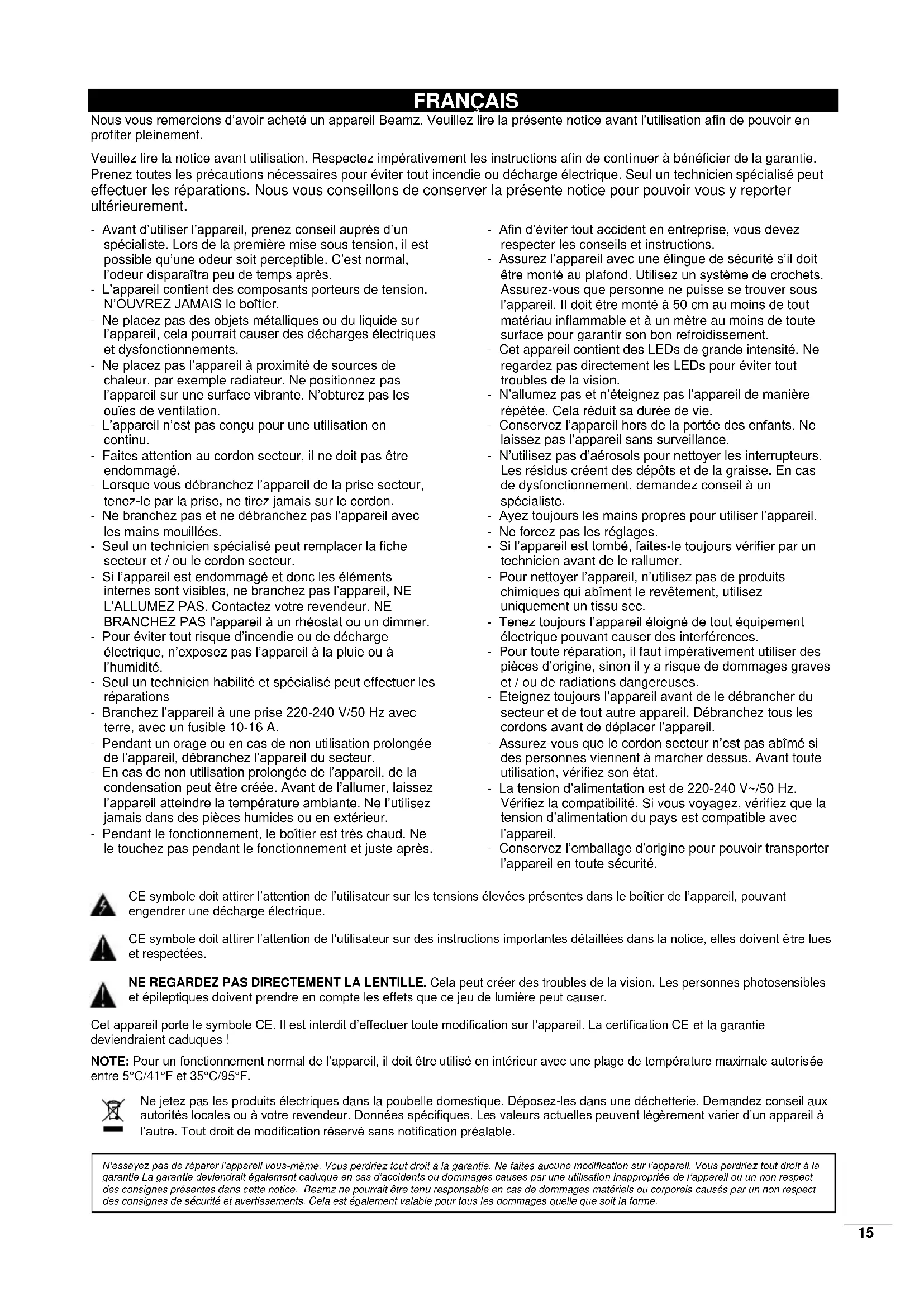 El proceso de limpieza debe ejecutarse en un area bien ventilada15 FRANÇAIS Nous vous remercions d’avoir acheté un appareil Beamz. Veuillez lire la présente notice avant l’utilisation afin de pouvoir en profiter pleinement. Veuillez lire la notice avant utilisation. Respectez impérativement les instructions afin de continuer à bénéficier de la garantie. Prenez toutes les précautions nécessaires pour éviter tout incendie ou décharge électrique. Seul un technicien spécialisé peut effectuer les réparations. Nous vous conseillons de conserver la présente notice pour pouvoir vous y reporter ultérieurement. - Avant d’utiliser l’appareil, prenez conseil auprès d’un spécialiste. Lors de la première mise sous tension, il est possible qu’une odeur soit perceptible. C’est normal, l’odeur disparaîtra peu de temps après. - L’appareil contient des composants porteurs de tension. N’OUVREZ JAMAIS le boîtier. - Ne placez pas des objets métalliques ou du liquide sur l’appareil, cela pourrait causer des décharges électriques et dysfonctionnements. - Ne placez pas l’appareil à proximité de sources de chaleur, par exemple radiateur. Ne positionnez pas l’appareil sur une surface vibrante. N’obturez pas les ouïes de ventilation. - L’appareil n’est pas conçu pour une utilisation en continu. - Faites attention au cordon secteur, il ne doit pas être endommagé. - Lorsque vous débranchez l’appareil de la prise secteur, tenez-le par la prise, ne tirez jamais sur le cordon. - Ne branchez pas et ne débranchez pas l’appareil avec les mains mouillées. - Seul un technicien spécialisé peut remplacer la fiche secteur et / ou le cordon secteur. - Si l’appareil est endommagé et donc les éléments internes sont visibles, ne branchez pas l’appareil, NE L’ALLUMEZ PAS. Contactez votre revendeur. NE BRANCHEZ PAS l’appareil à un rhéostat ou un dimmer. - Pour éviter tout risque d’incendie ou de décharge électrique, n’exposez pas l’appareil à la pluie ou à l’humidité. - Seul un technicien habilité et spécialisé peut effectuer les réparations - Branchez l’appareil à une prise 220-240 V/50 Hz avec terre, avec un fusible 10-16 A. - Pendant un orage ou en cas de non utilisation prolongée de l’appareil, débranchez l’appareil du secteur. - En cas de non utilisation prolongée de l’appareil, de la condensation peut être créée. Avant de l’allumer, laissez l’appareil atteindre la température ambiante. Ne l’utilisez jamais dans des pièces humides ou en extérieur. - Pendant le fonctionnement, le boîtier est très chaud. Ne le touchez pas pendant le fonctionnement et juste après. - Afin d’éviter tout accident en entreprise, vous devez respecter les conseils et instructions. - Assurez l’appareil avec une élingue de sécurité s’il doit être monté au plafond. Utilisez un système de crochets. Assurez-vous que personne ne puisse se trouver sous l’appareil. Il doit être monté à 50 cm au moins de tout matériau inflammable et à un mètre au moins de toute surface pour garantir son bon refroidissement. - Cet appareil contient des LEDs de grande intensité. Ne regardez pas directement les LEDs pour éviter tout troubles de la vision. - N’allumez pas et n’éteignez pas l’appareil de manière répétée. Cela réduit sa durée de vie. - Conservez l’appareil hors de la portée des enfants. Ne laissez pas l’appareil sans surveillance. - N’utilisez pas d’aérosols pour nettoyer les interrupteurs. Les résidus créent des dépôts et de la graisse. En cas de dysfonctionnement, demandez conseil à un spécialiste. - Ayez toujours les mains propres pour utiliser l’appareil. - Ne forcez pas les réglages. - Si l’appareil est tombé, faites-le toujours vérifier par un technicien avant de le rallumer. - Pour nettoyer l’appareil, n’utilisez pas de produits chimiques qui abîment le revêtement, utilisez uniquement un tissu sec. - Tenez toujours l’appareil éloigné de tout équipement électrique pouvant causer des interférences. - Pour toute réparation, il faut impérativement utiliser des pièces d’origine, sinon il y a risque de dommages graves et / ou de radiations dangereuses. - Eteignez toujours l’appareil avant de le débrancher du secteur et de tout autre appareil. Débranchez tous les cordons avant de déplacer l’appareil. - Assurez-vous que le cordon secteur n’est pas abîmé si des personnes viennent à marcher dessus. Avant toute utilisation, vérifiez son état. - La tension d’alimentation est de 220-240 V~/50 Hz. Vérifiez la compatibilité. Si vous voyagez, vérifiez que la tension d’alimentation du pays est compatible avec l’appareil. - Conservez l’emballage d’origine pour pouvoir transporter l’appareil en toute sécurité. CE symbole doit attirer l’attention de l’utilisateur sur les tensions élevées présentes dans le boîtier de l’appareil, pouvant engendrer une décharge électrique. CE symbole doit attirer l’attention de l’utilisateur sur des instructions importantes détaillées dans la notice, elles doivent être lues et respectées. NE REGARDEZ PAS DIRECTEMENT LA LENTILLE. Cela peut créer des troubles de la vision. Les personnes photosensibles et épileptiques doivent prendre en compte les effets que ce jeu de lumière peut causer. Cet appareil porte le symbole CE. Il est interdit d’effectuer toute modification sur l’appareil. La certification CE et la garantie deviendraient caduques ! NOTE: Pour un fonctionnement normal de l’appareil, il doit être utilisé en intérieur avec une plage de température maximale autorisée entre 5°C/41°F et 35°C/95°F.