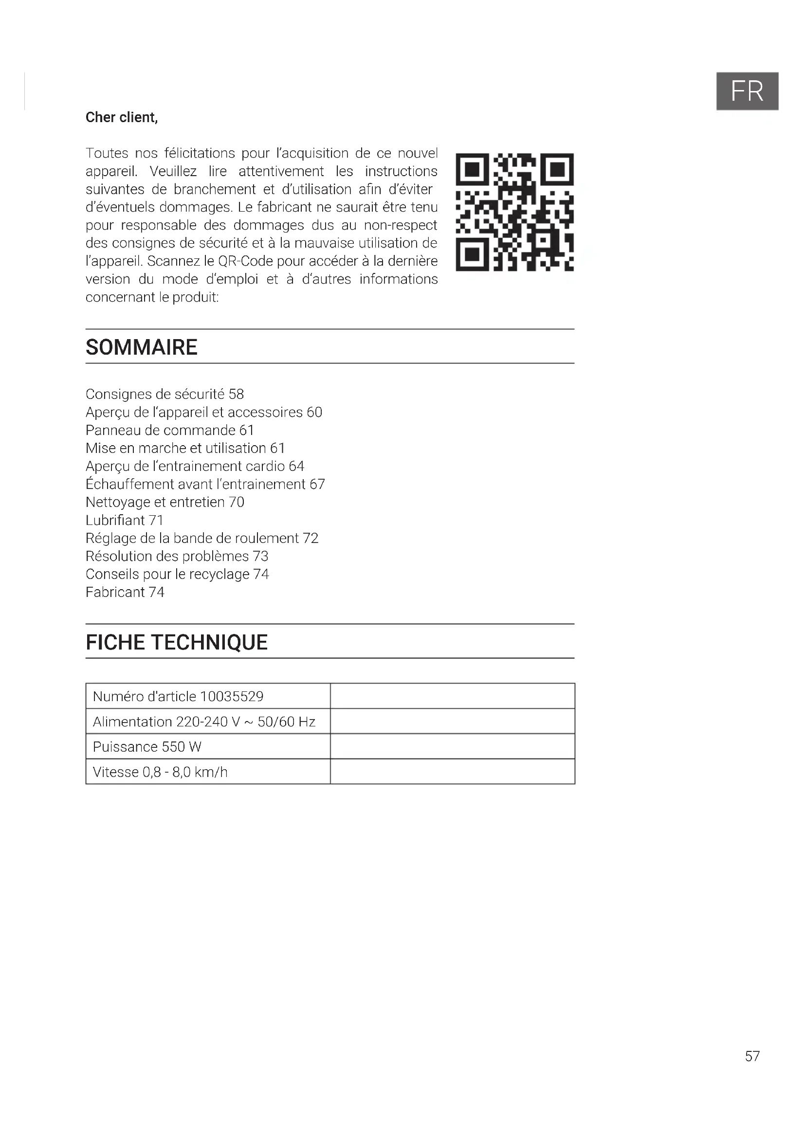 Cher client, Toutes nos félicitations pour l’acquisition de ce nouvel appareil. Veuillez lire attentivement les instructions suivantes de branchement et d’utilisation an d’éviter d’éventuels dommages. Le fabricant ne saurait être tenu pour responsable des dommages dus au non-respect des consignes de sécurité et à la mauvaise utilisation de l’appareil. Scannez le QR-Code pour accéder à la dernière version du mode d‘emploi et à d‘autres informations concernant le produit: SOMMAIRE Consignes de sécurité 58 Aperçu de l‘appareil et accessoires 60 Panneau de commande 61 Mise en marche et utilisation 61 Aperçu de l‘entrainement cardio 64 Échauffement avant l‘entrainement 67 Nettoyage et entretien 70 Lubriant 71 Réglage de la bande de roulement 72 Résolution des problèmes 73 Conseils pour le recyclage 74 Fabricant 74 FICHE TECHNIQUE Numéro d'article 10035529 Alimentation 220-240 V ~ 50/60 Hz Puissance 550 W Vitesse 0,8 - 8,0 km/h58