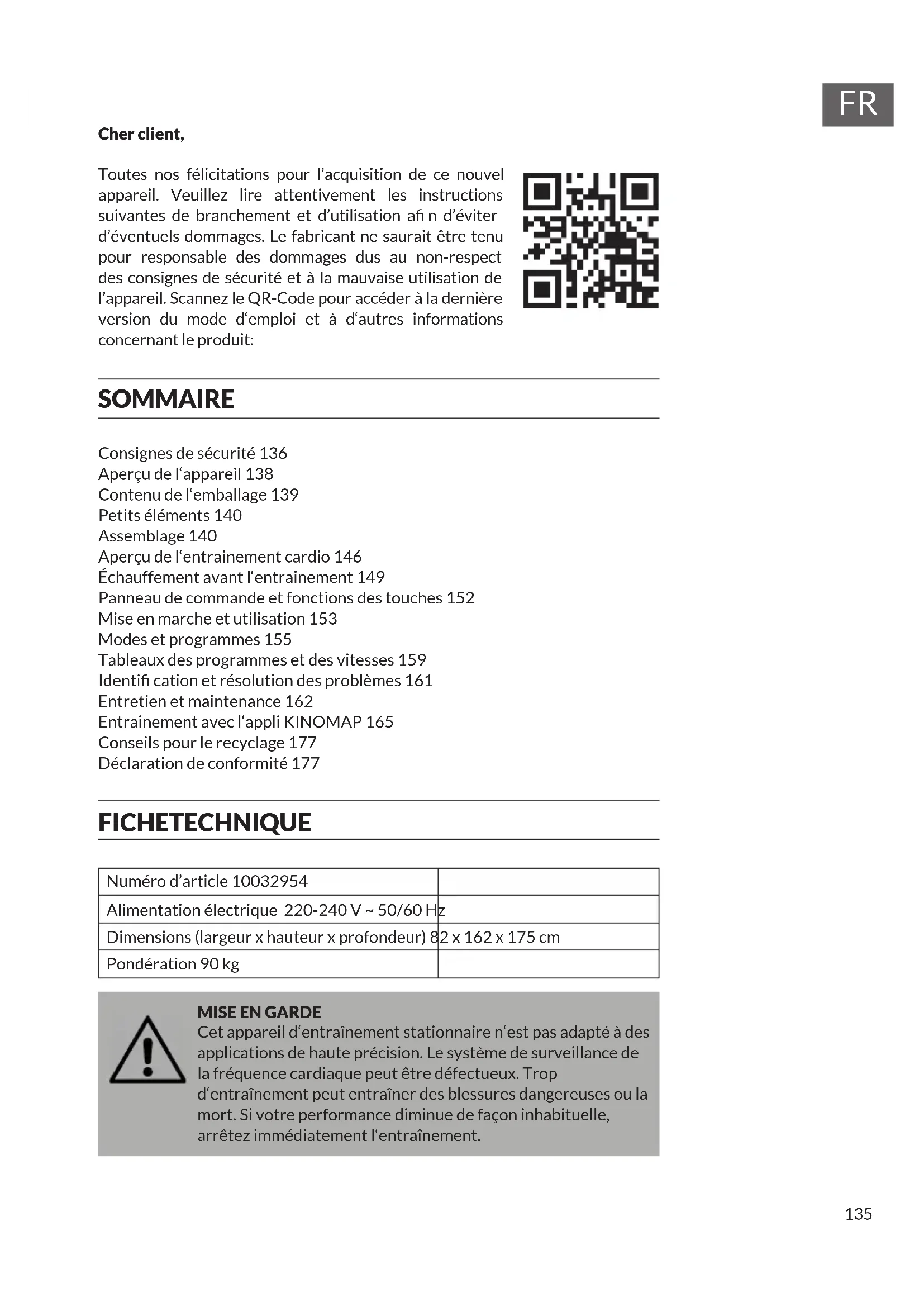 Cher client, Toutes nos félicitations pour l’acquisition de ce nouvel appareil. Veuillez lire attentivement les instructions suivantes de branchement et d’utilisation a n d’éviter d’éventuels dommages. Le fabricant ne saurait être tenu pour responsable des dommages dus au non-respect des consignes de sécurité et à la mauvaise utilisation de l’appareil. Scannez le QR-Code pour accéder à la dernière version du mode d‘emploi et à d‘autres informations concernant le produit: SOMMAIRE Consignes de sécurité 136 Aperçu de l‘appareil 138 Contenu de l‘emballage 139 Petits éléments 140 Assemblage 140 Aperçu de l‘entrainement cardio 146 Échauffement avant l‘entrainement 149 Panneau de commande et fonctions des touches 152 Mise en marche et utilisation 153 Modes et programmes 155 Tableaux des programmes et des vitesses 159 Identi cation et résolution des problèmes 161 Entretien et maintenance 162 Entrainement avec l‘appli KINOMAP 165 Conseils pour le recyclage 177 Déclaration de conformité 177 FICHE TECHNIQUE Numéro d’article 10032954 Alimentation électrique 220-240 V ~ 50/60 Hz Dimensions (largeur x hauteur x profondeur) 82 x 162 x 175 cm Pondération 90 kg