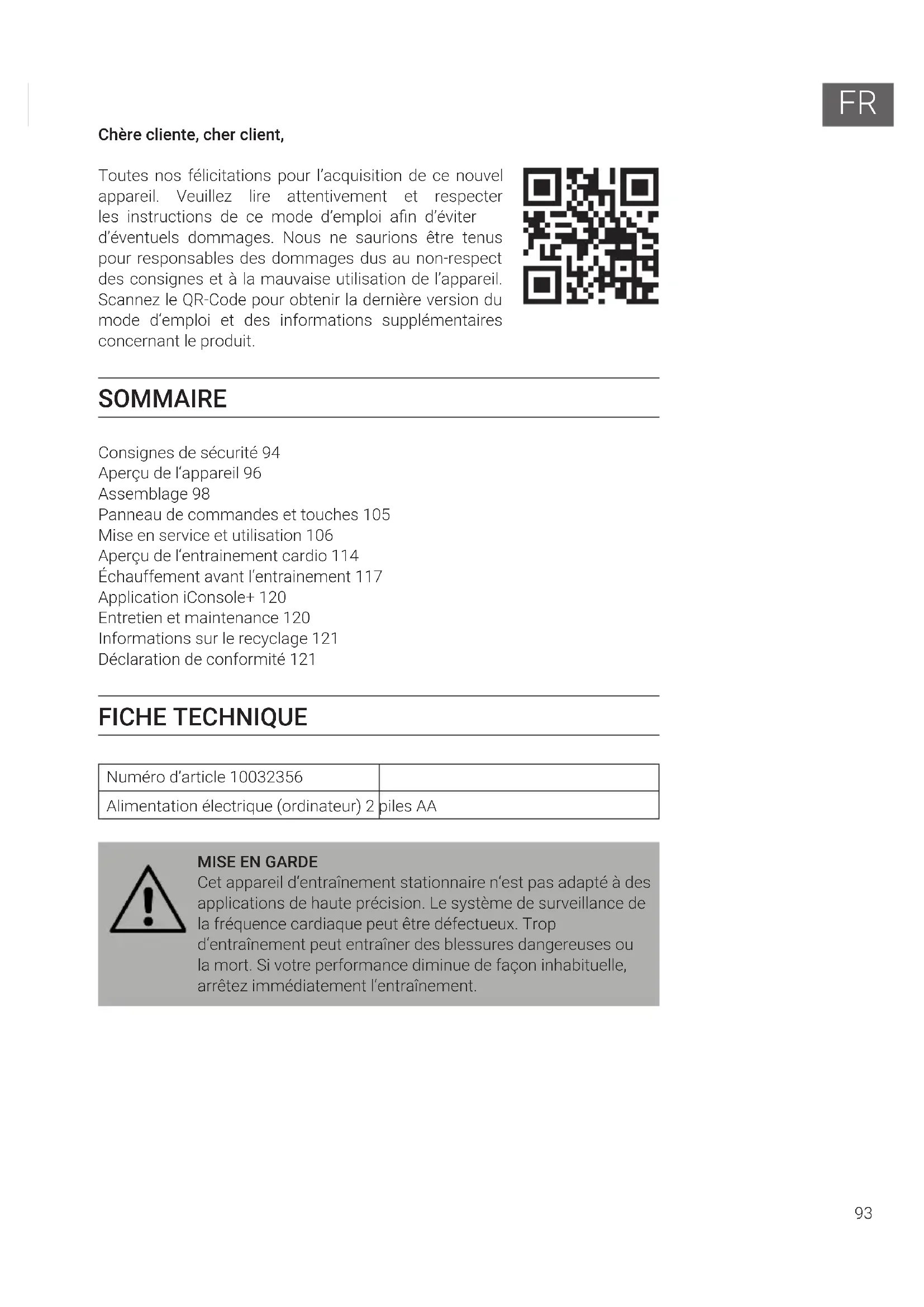 Chère cliente, cher client, Toutes nos félicitations pour l’acquisition de ce nouvel appareil. Veuillez lire attentivement et respecter les instructions de ce mode d’emploi an d’éviter d’éventuels dommages. Nous ne saurions être tenus pour responsables des dommages dus au non-respect des consignes et à la mauvaise utilisation de l’appareil. Scannez le QR-Code pour obtenir la dernière version du mode d‘emploi et des informations supplémentaires concernant le produit. SOMMAIRE Consignes de sécurité 94 Aperçu de l‘appareil 96 Assemblage 98 Panneau de commandes et touches 105 Mise en service et utilisation 106 Aperçu de l‘entrainement cardio 114 Échauffement avant l‘entrainement 117 Application iConsole+ 120 Entretien et maintenance 120 Informations sur le recyclage 121 Déclaration de conformité 121 FICHE TECHNIQUE Numéro d’article 10032356 Alimentation électrique (ordinateur) 2 piles AA