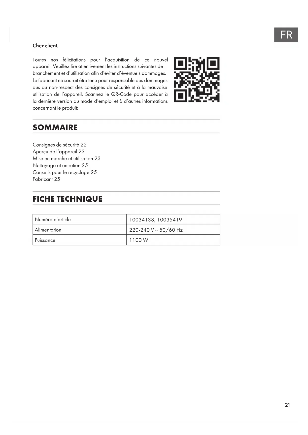 Cher client, Toutes nos félicitations pour l’acquisition de ce nouvel appareil. Veuillez lire attentivement les instructions suivantes de branchement et d’utilisation an d’éviter d’éventuels dommages. Le fabricant ne saurait être tenu pour responsable des dommages dus au non-respect des consignes de sécurité et à la mauvaise utilisation de l’appareil. Scannez le QR-Code pour accéder à la dernière version du mode d‘emploi et à d‘autres informations concernant le produit: SOMMAIRE Consignes de sécurité22 Aperçu de l‘appareil23 Mise en marche et utilisation23 Nettoyage et entretien25 Conseils pour le recyclage25 Fabricant 25 FICHE TECHNIQUE Numéro d'article 10034138, 10035419 Alimentation 220-240 V ~ 50/60 Hz Puissance 1100 W22