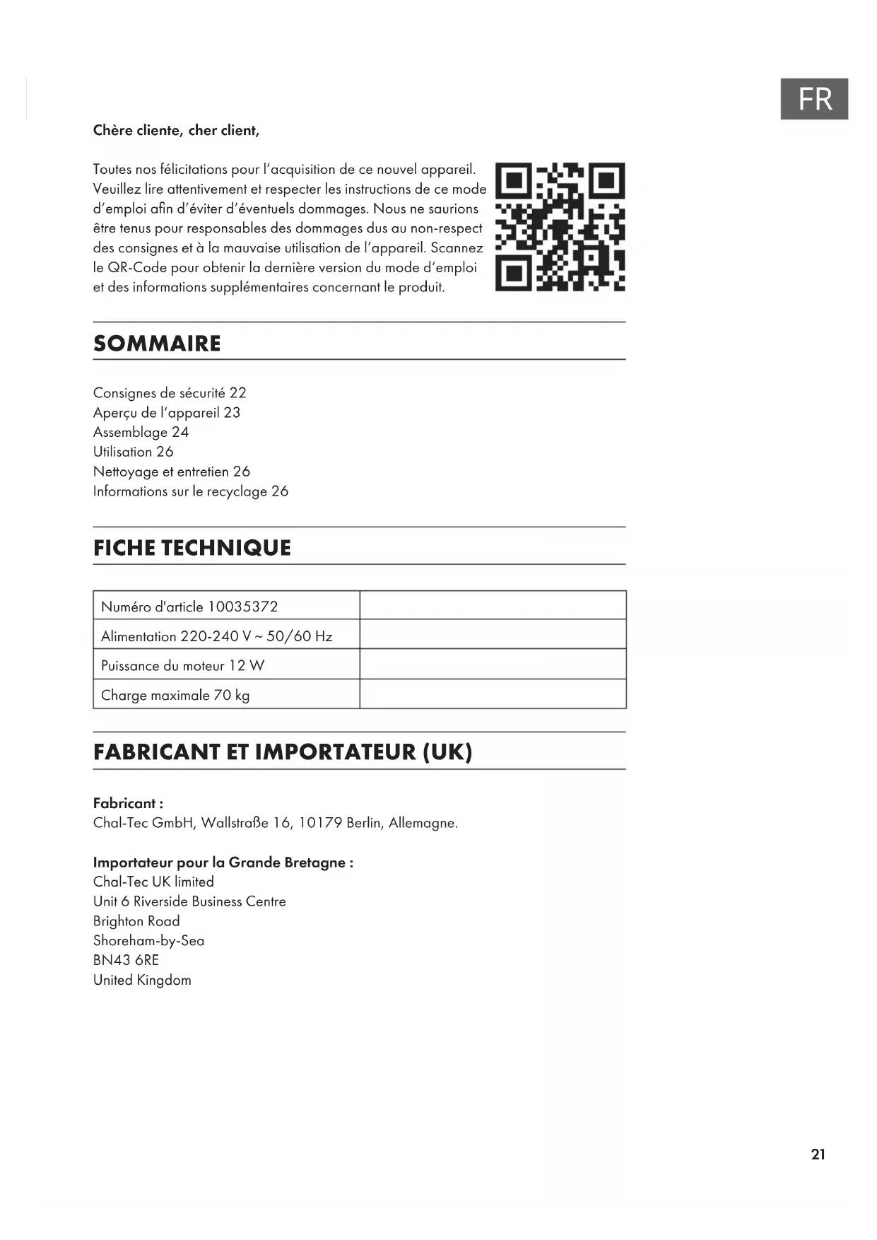 Chère cliente, cher client, Toutes nos félicitations pour l’acquisition de ce nouvel appareil. Veuillez lire attentivement et respecter les instructions de ce mode d’emploi an d’éviter d’éventuels dommages. Nous ne saurions être tenus pour responsables des dommages dus au non-respect des consignes et à la mauvaise utilisation de l’appareil. Scannez le QR-Code pour obtenir la dernière version du mode d‘emploi et des informations supplémentaires concernant le produit. SOMMAIRE Consignes de sécurité22 Aperçu de l‘appareil23 Assemblage24 Utilisation26 Nettoyage et entretien26 Informations sur le recyclage26 FICHE TECHNIQUE Numéro d'article 10035372 Alimentation 220-240 V ~ 50/60 Hz Puissance du moteur 12 W Charge maximale 70 kg FABRICANT ET IMPORTATEUR (UK) Fabricant : Chal-Tec GmbH, Wallstraße 16, 10179 Berlin, Allemagne. Importateur pour la Grande Bretagne : Chal-Tec UK limited Unit 6 Riverside Business Centre Brighton Road Shoreham-by-Sea BN43 6RE United Kingdom22