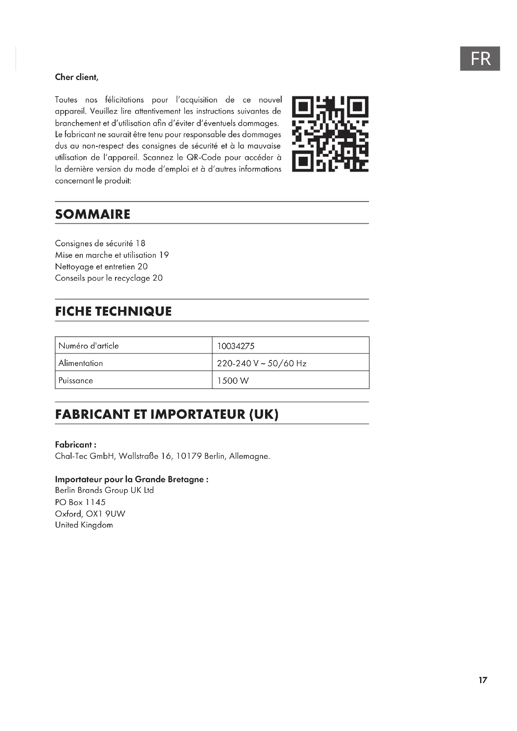 Cher client, Toutes nos félicitations pour l’acquisition de ce nouvel appareil. Veuillez lire attentivement les instructions suivantes de branchement et d’utilisation an d’éviter d’éventuels dommages. Le fabricant ne saurait être tenu pour responsable des dommages dus au non-respect des consignes de sécurité et à la mauvaise utilisation de l’appareil. Scannez le QR-Code pour accéder à la dernière version du mode d‘emploi et à d‘autres informations concernant le produit: SOMMAIRE Consignes de sécurité18 Mise en marche et utilisation19 Nettoyage et entretien20 Conseils pour le recyclage20 FICHE TECHNIQUE Numéro d'article
